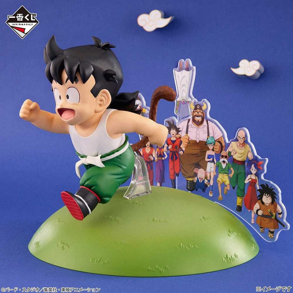 Figura Ichiban Kuji de Gohan, inspirada en el ending de Dragon Ball Z, perteneciente a la colección Dragon Ball Snap Collection 2. La escena muestra a Gohan niño corriendo con una expresión alegre mientras detrás aparecen ilustraciones de varios personajes del universo de Dragon Ball en un estilo que recuerda a los créditos finales del anime.