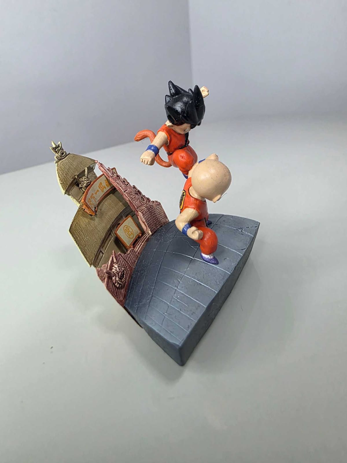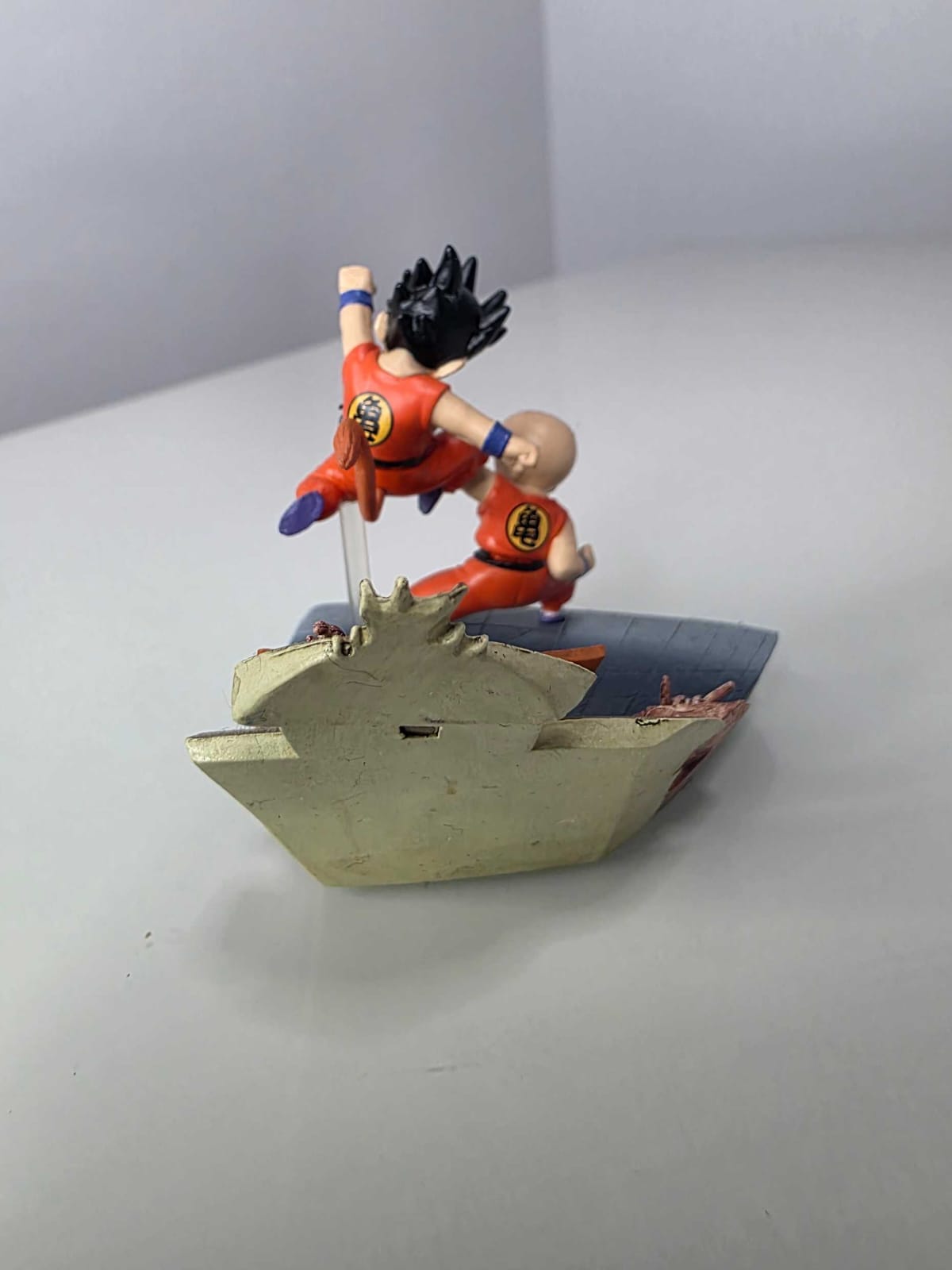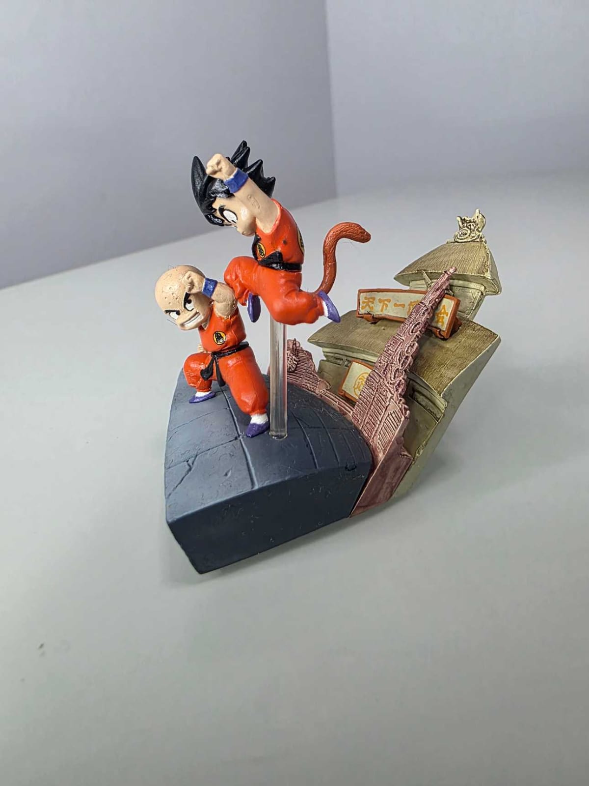 La base y el fondo recrean muy bien el ambiente clásico del campeonato, con poses dinámicas que transmiten energía y rivalidad amistosa. Pieza fija, no articulada, ideal para vitrinas o dioramas del Dragon Ball original.