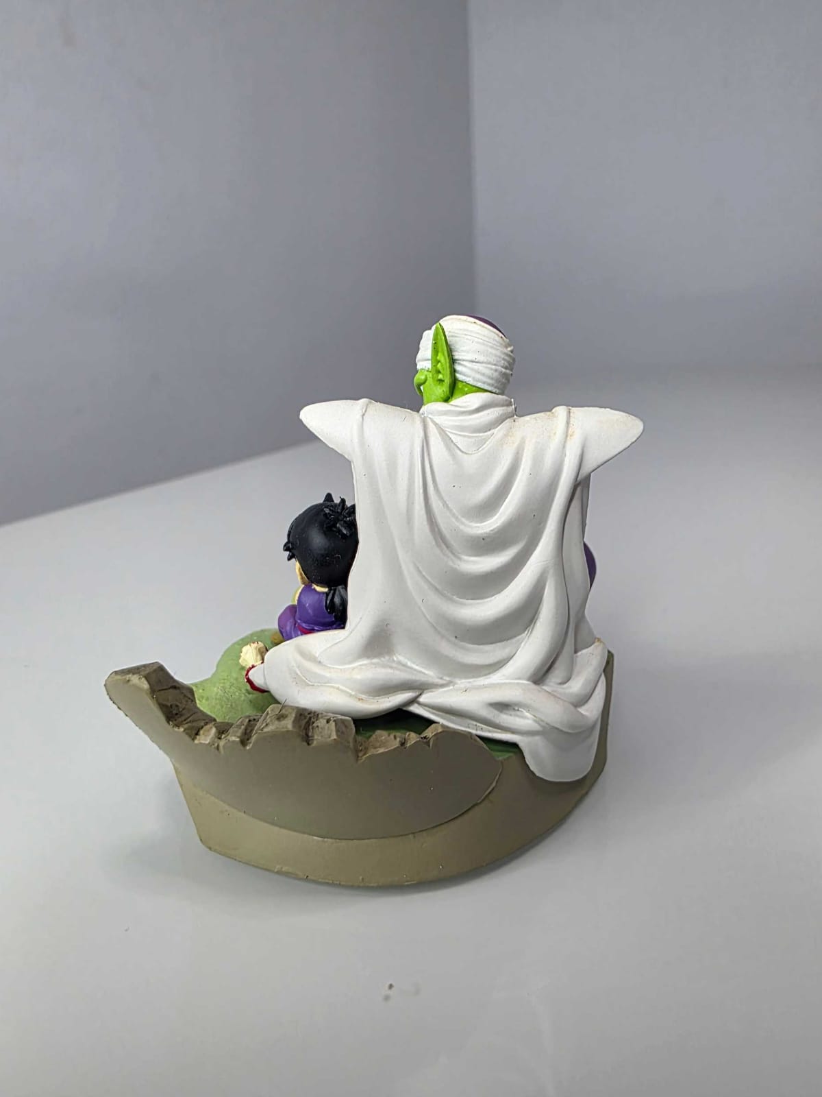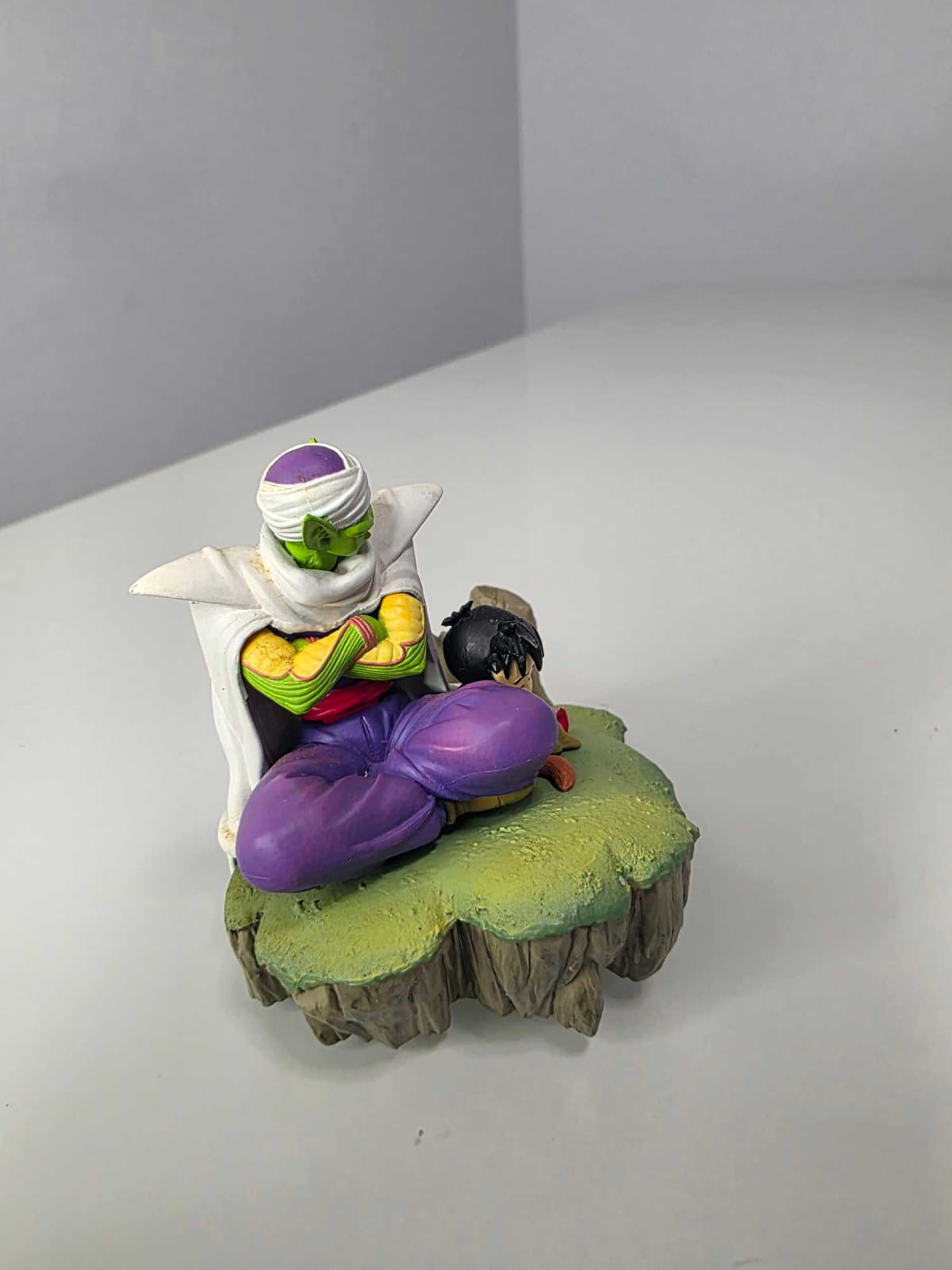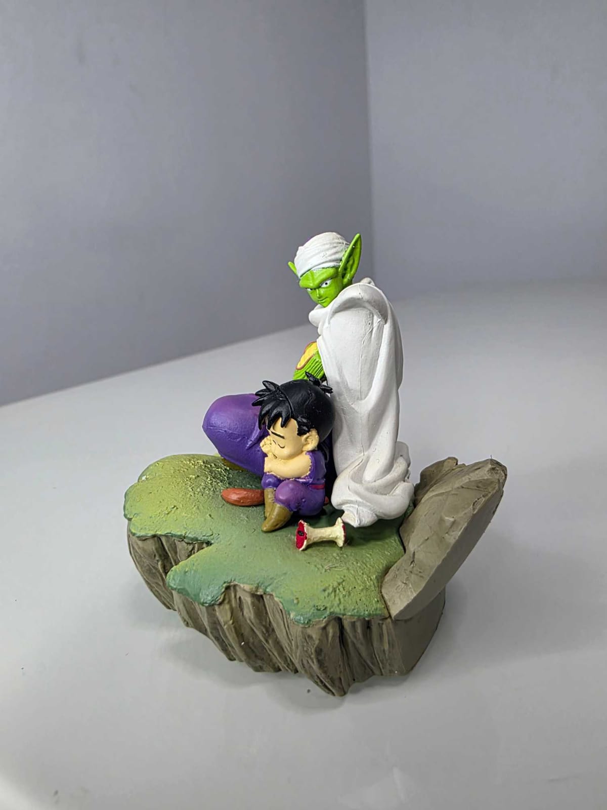 El trabajo de pintura resalta los tonos del terreno rocoso y la postura serena de Piccolo, contrastando con la inocencia de Gohan dormido. Pieza fija, no articulada, ideal para vitrinas o dioramas de la saga Saiyajin.