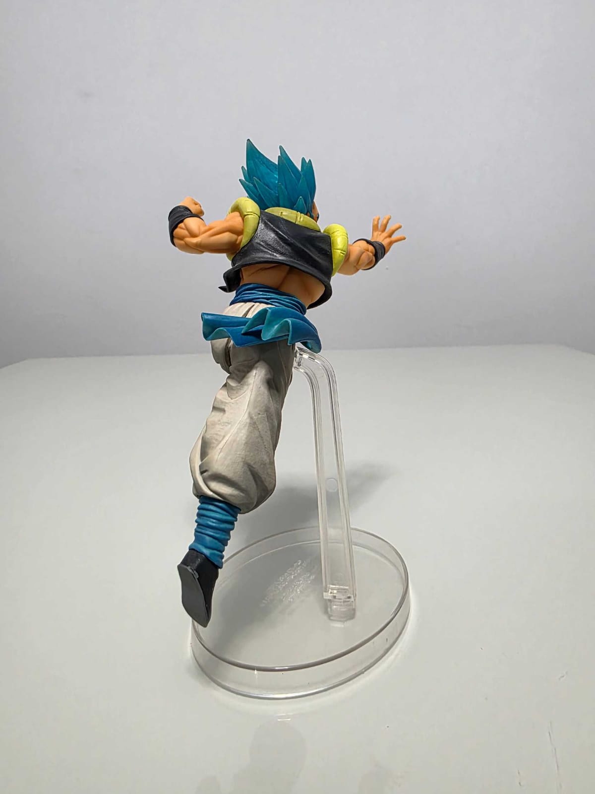 Figura de fusión Gogeta (forma Super Saiyan Blue) perteneciente a la línea Revible Moment. Pose dinámica con extremidades extendidas, expresión concentrada. Detalles de ropa, pliegues y colores bien trabajados. Base transparente incluida para exhibición “flotante”. Material: PVC / ABS. Ideal para colecciones de personajes de Dragon Ball Super, fusión, etc.