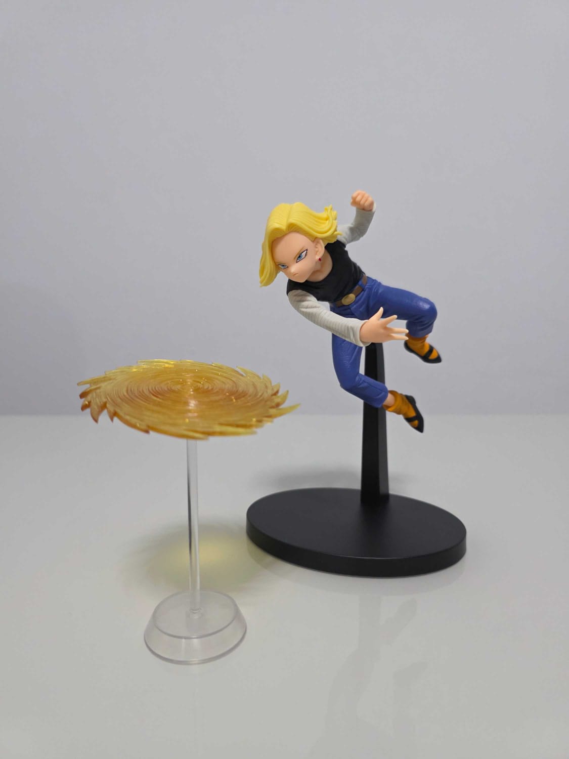 Esta pieza pertenece a la línea G×materia, representando a Androide 18 con gran detalle. Pose natural pero con dinamismo, cabello y expresiones bien trabajados, pintura sombreada con transición suave, y acabados de calidad. No tiene articulaciones; ideal como figura de exhibición estática. Incluye base de soporte para mantenerla estable.