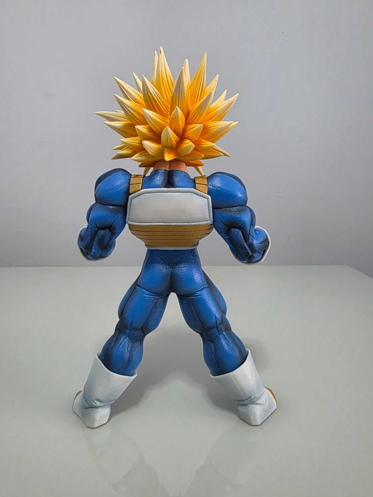 Representación de Trunks del futuro en su transformación Super Saiyajin Ultra (forma musculosa). Escultura detallada con aura de poder y acabado brillante en cabello. Pieza sólida con postura de carga de energía.