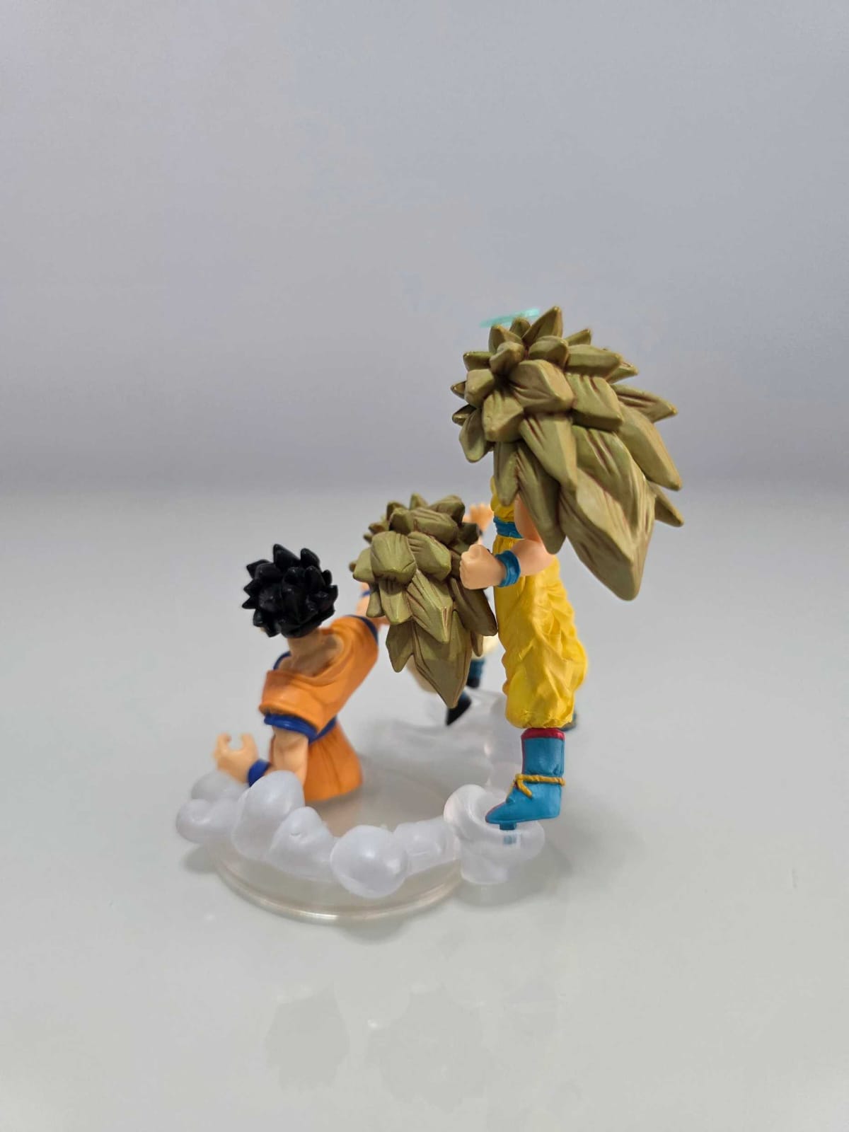 Diorama triple con Gotenks, Goku y Gohan Definitivo, todos en posición de ataque coordinado. Base de soporte transparente con efecto de energía. Una de las escenas más dinámicas de la línea Imagination.