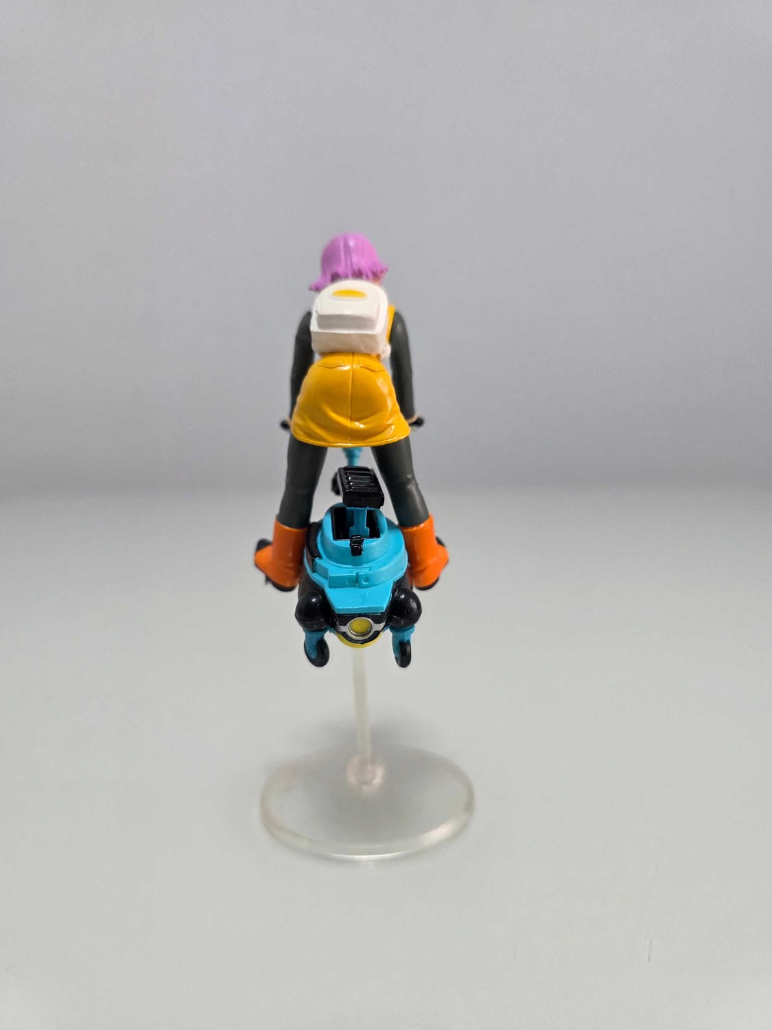 Figura de Bulma sobre su moto voladora azul, parte de la serie Mecha Collection. Modelo con soporte transparente y pintura brillante. Escala 1/35, ideal para combinar con otras motos de la línea.