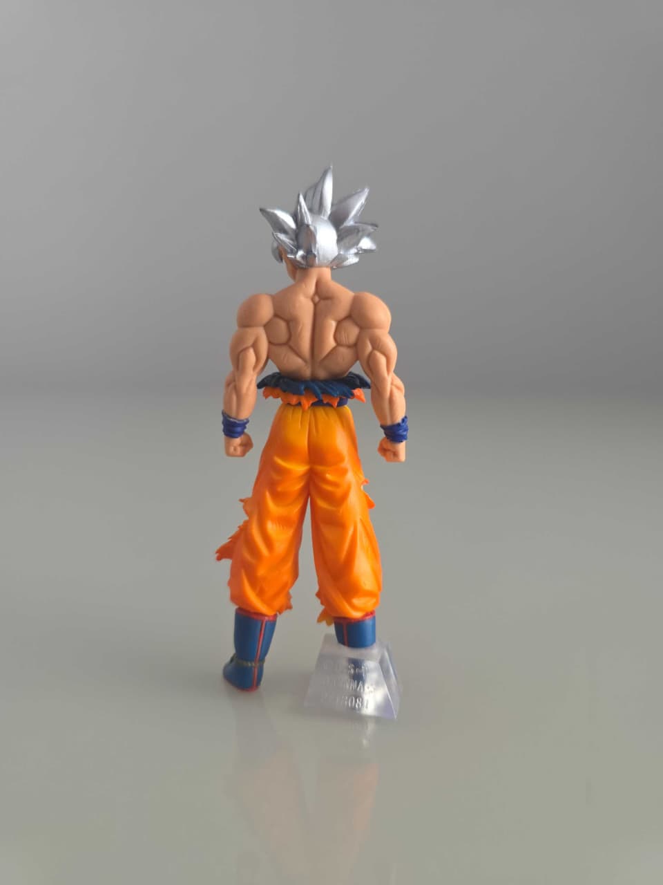 Figura de Goku Ultra Instinto (cabello plateado) con expresión seria y traje rasgado.