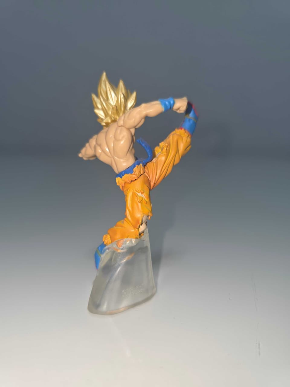 Figura dinámica de Goku Super Saiyajin en plena patada voladora. Escultura en movimiento con excelente equilibrio gracias a su base translúcida.