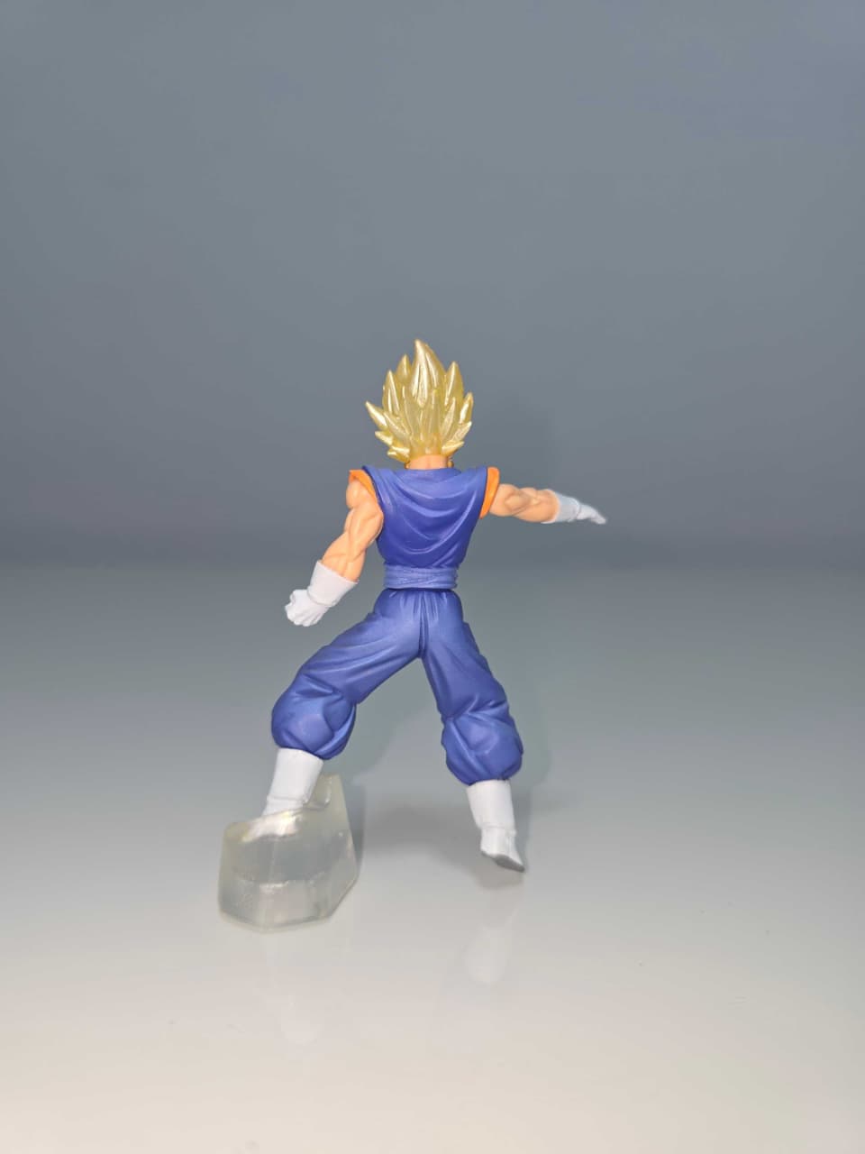 Figura de Vegito SSJ en posición de ataque, apuntando con el brazo derecho. Escultura precisa del traje azul y el cabello dorado brillante.