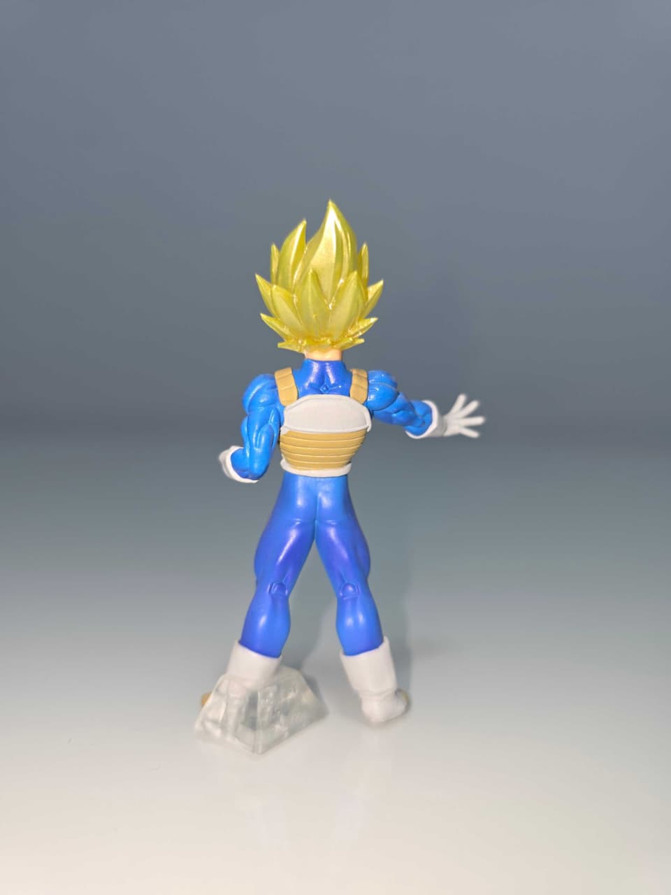 Figura de Vegeta SSJ con armadura azul y pose de combate. Refleja su fuerza durante la saga de Cell o Buu.
