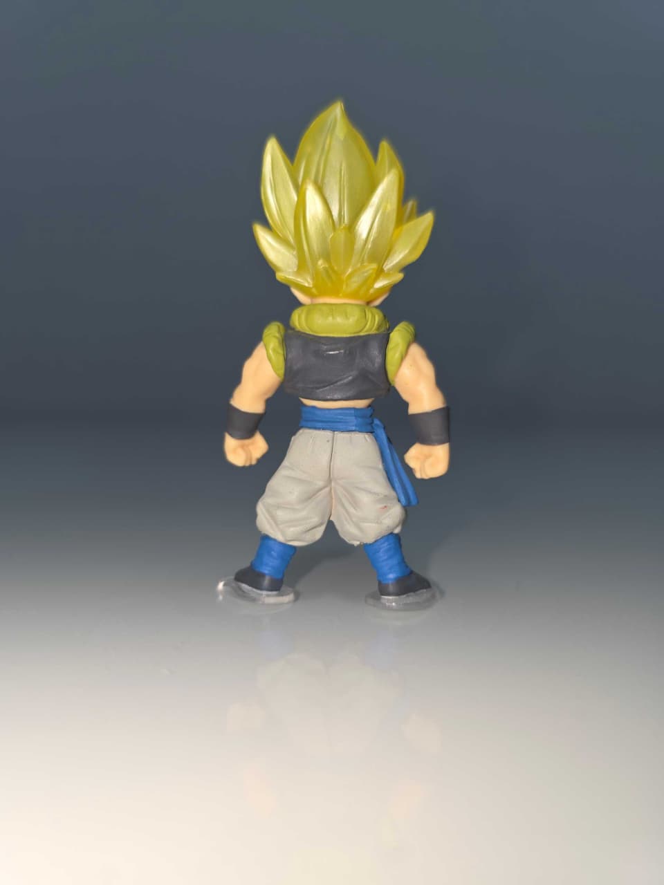 Figura de Gogeta SSJ, con cabello dorado y expresión decidida. Traje gris con cinturón azul y chaleco negro con detalles amarillos.