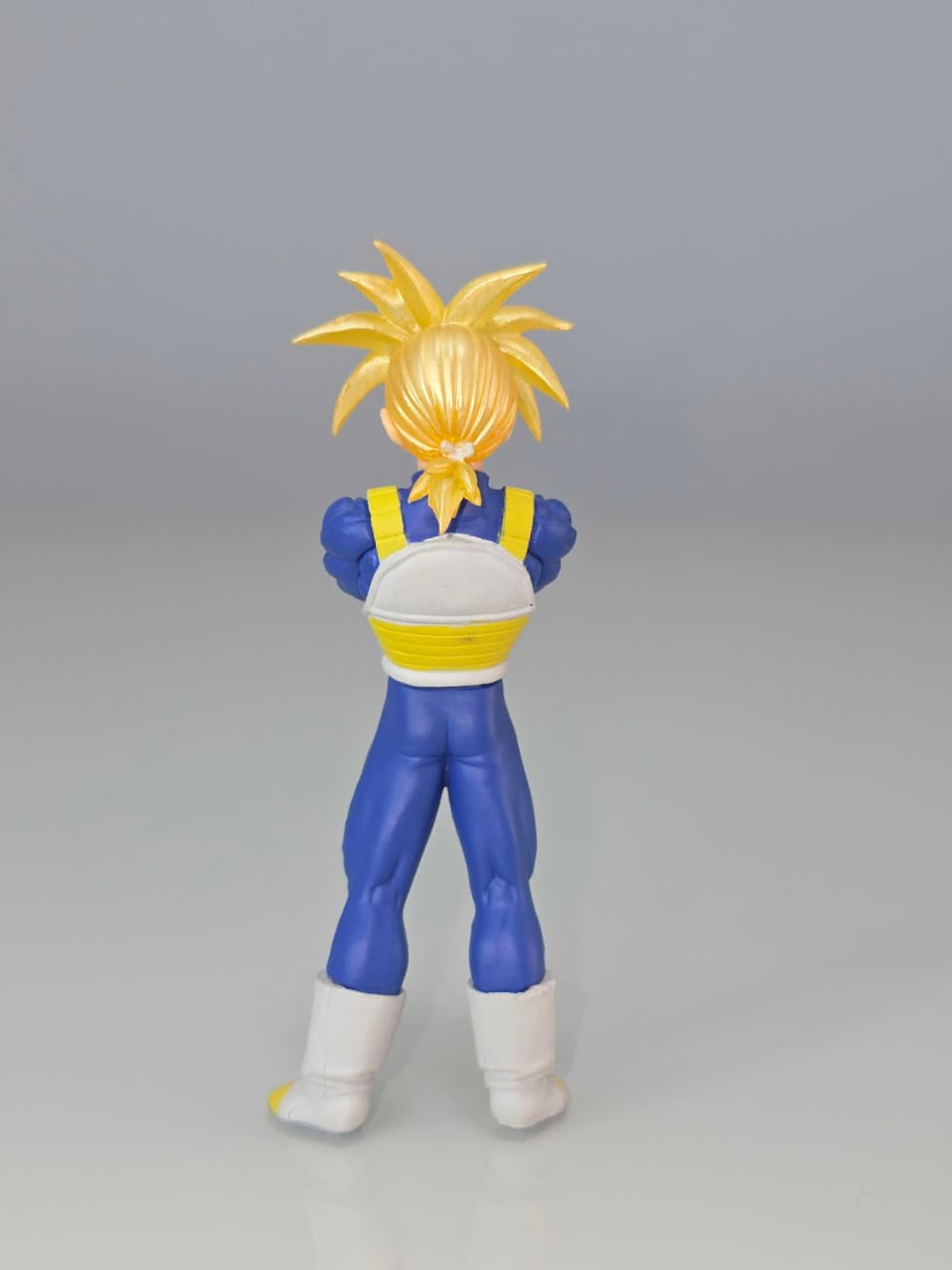 Figura de Trunks SSJ con la clásica armadura saiyajin y pose de brazos cruzados, mostrando confianza antes del combate contra Cell. Detalle en cabello dorado y expresión seria.
