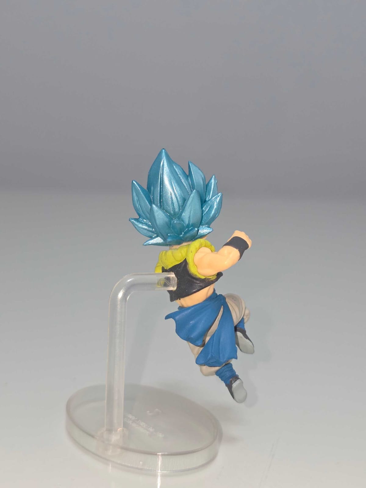 Figura de Gogeta en Super Saiyajin Blue con cabello azul metálico y pose de ataque aéreo. Lleva el chaleco de fusión negro y amarillo, expresión determinada y base transparente de soporte.
