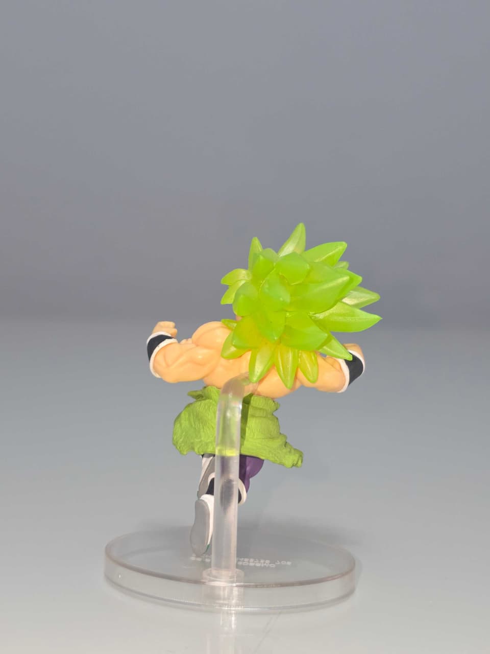 Broly en modo Super Saiyajin Legendario, con cabello verde brillante, pantalones morados y cinturón de piel verde. Pose de vuelo con ambos puños al frente y base transparente para sostén.