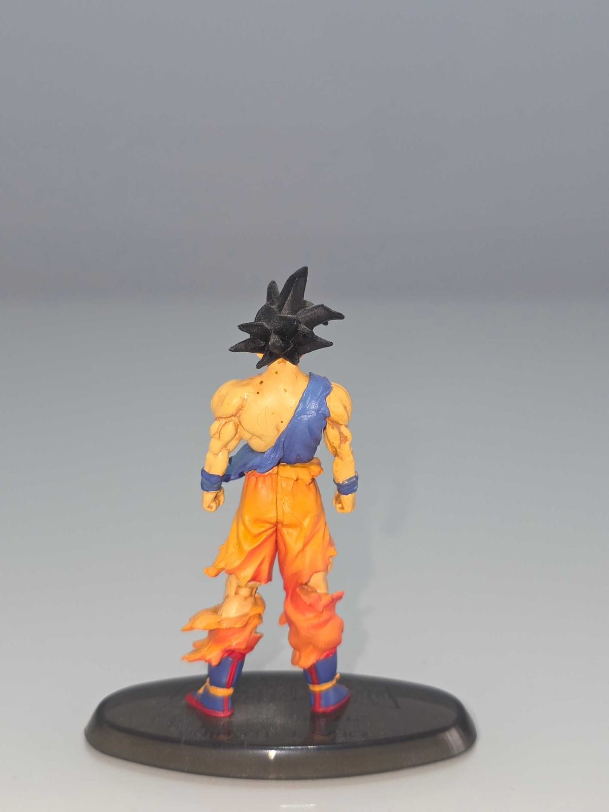 Goku en estado base, cabello negro, uniforme dañado, con base negra e inscripción japonesa. Esculpido detallado que destaca el rostro y musculatura.