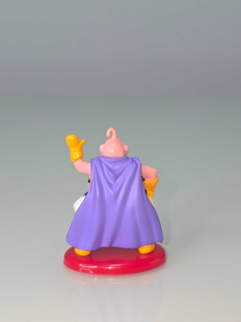 Figura de Majin Buu (Good Buu) saludando, con traje blanco, guantes amarillos y capa violeta. Base roja con acabado brillante.