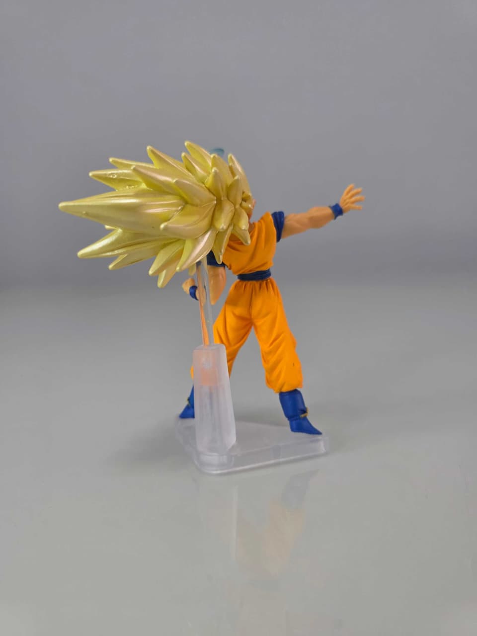 Figura de Goku en Super Saiyajin 3, con cabello dorado brillante y uniforme clásico naranja con fajín azul. Muestra una pose de ataque con el brazo derecho extendido, lista para lanzar un poderoso golpe o ráfaga de energía. Incluye base transparente triangular para soporte.