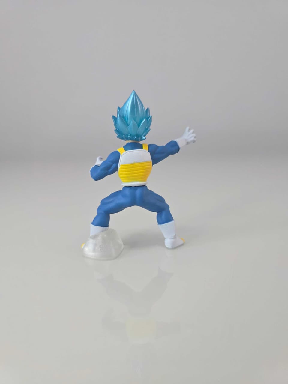 Figura de Vegeta en Super Saiyajin Blue (SSGSS), con cabello azul metálico y su armadura blanca con detalles amarillos. En pose de ataque, con una mano extendida al frente preparando una ráfaga de energía. Base transparente para estabilidad.