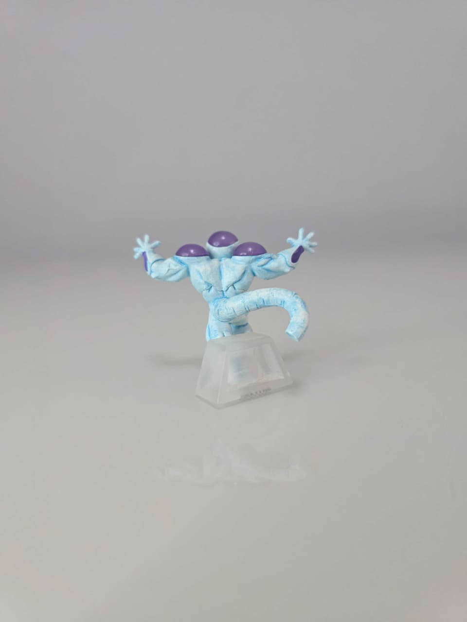 Figura de Freezer en su forma final al 100% de poder, con músculos marcados y tonos azulados por la energía concentrada. Pose de ataque con ambos brazos extendidos hacia abajo. Base transparente incluida.