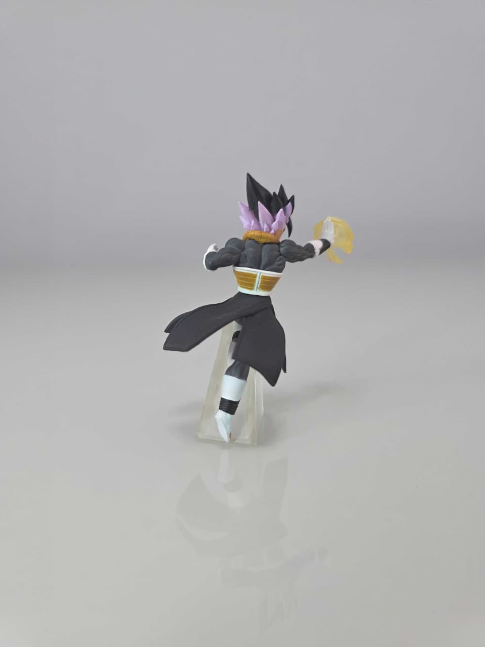 Figura de Vegeks (fusión EX de Vegeta y Trunks) en su versión Xeno, con cabello negro en punta y armadura saiyajin blanca sobre abrigo largo negro. Pose de ataque avanzando, con esfera de ki amarilla en la mano derecha y efecto de energía morado translúcido en el brazo izquierdo. Incluye base transparente para estabilidad.