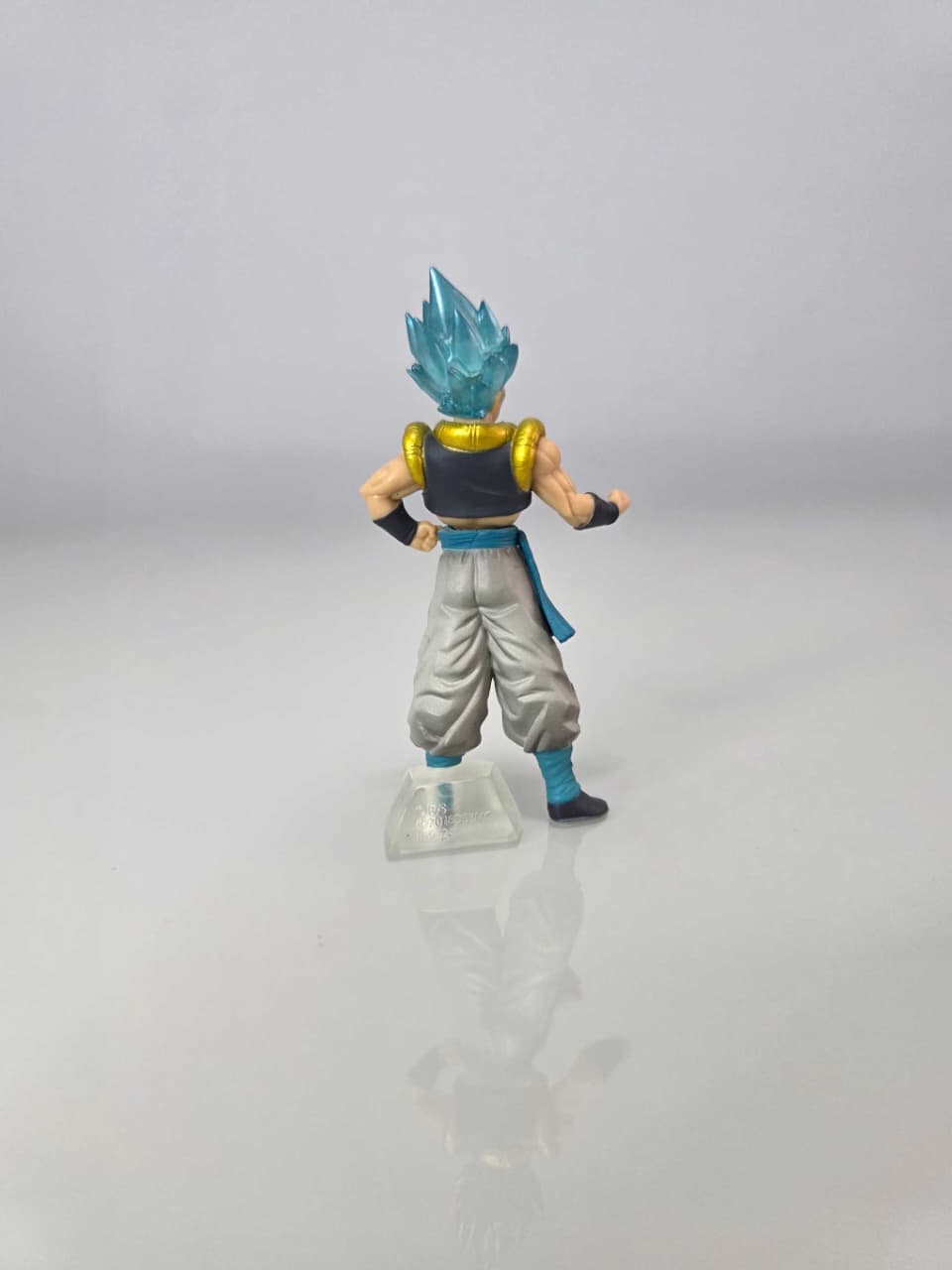 Figura de Gogeta Blue, con cabello azul perlado y chaleco amarillo. En postura de combate con puño cerrado, listo para enfrentarse a Broly. Basado en la película Dragon Ball Super: Broly.