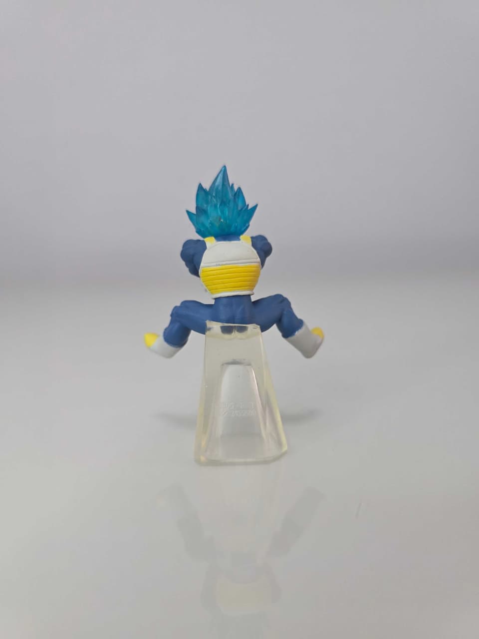 Figura de Vegeta en Super Saiyan Blue, con cabello azul perlado y traje de combate. En postura de ataque con ambas manos al frente, lanzando una ráfaga de energía.