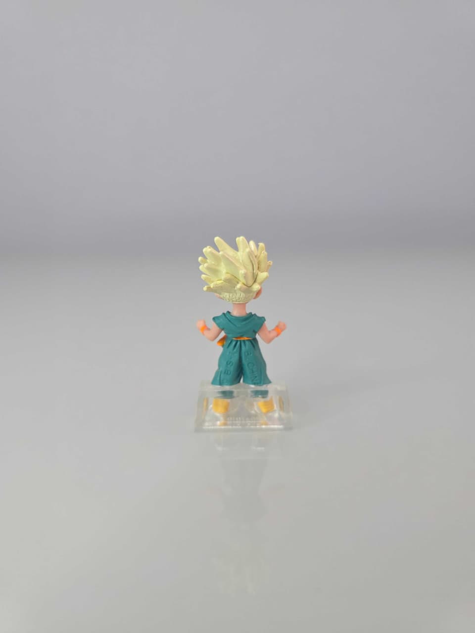 Figura de Trunks niño Super Saiyan, con cabello dorado y traje celeste con cinturón naranja. Pose desafiante lista para la batalla del Torneo de Artes Marciales Junior.