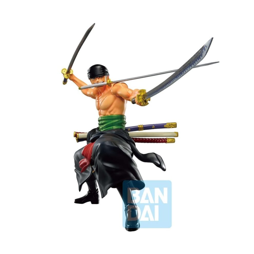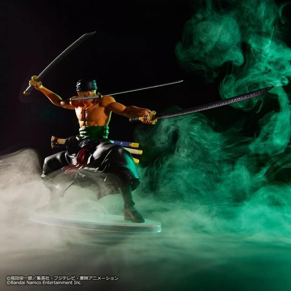 Figura de Roronoa Zoro en una pose de combate con sus tres espadas (Santoryu), inspirada en el videojuego One Piece Treasure Cruise. Destaca por el esculpido detallado del torso y las katanas, además del característico vendaje verde en la cintura.