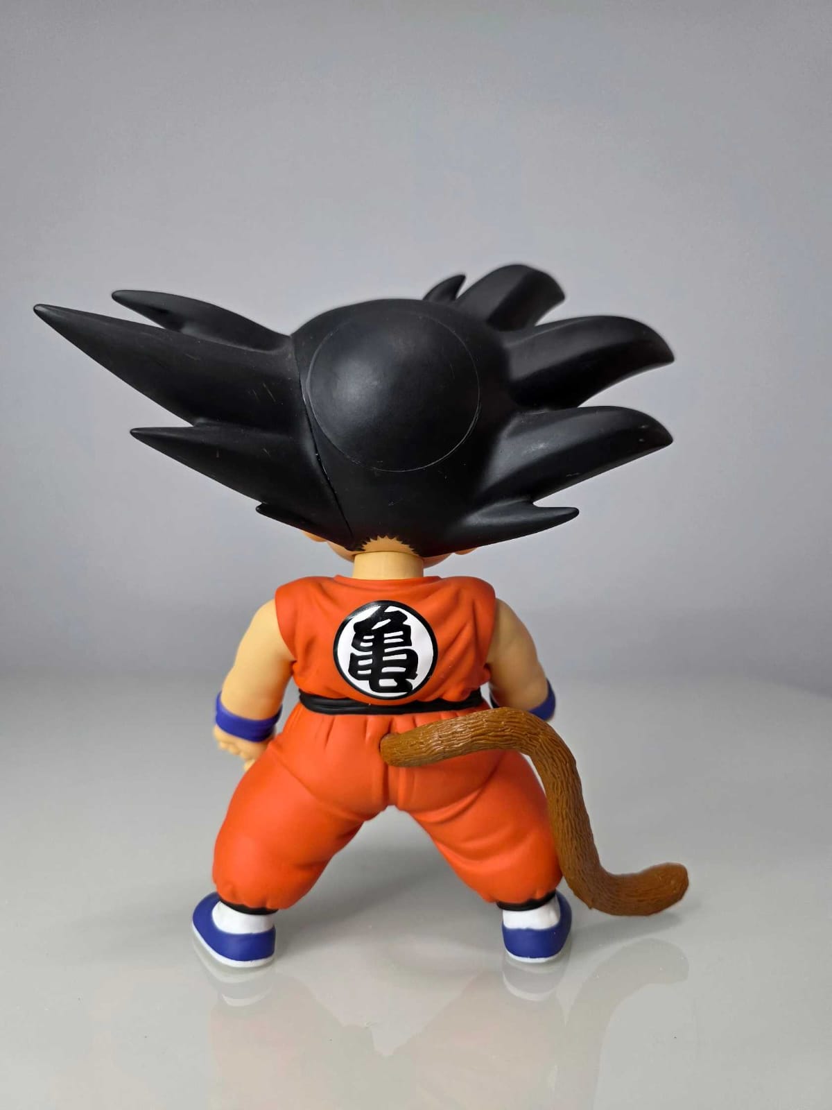 Figura de Gokú niño con su clásico gi naranja y cinturón negro, cola de mono y expresión alegre. Un diseño inspirado en su etapa inicial de Dragon Ball, fabricado en vinilo suave tipo sofubi, con estilo retro y acabado brillante.