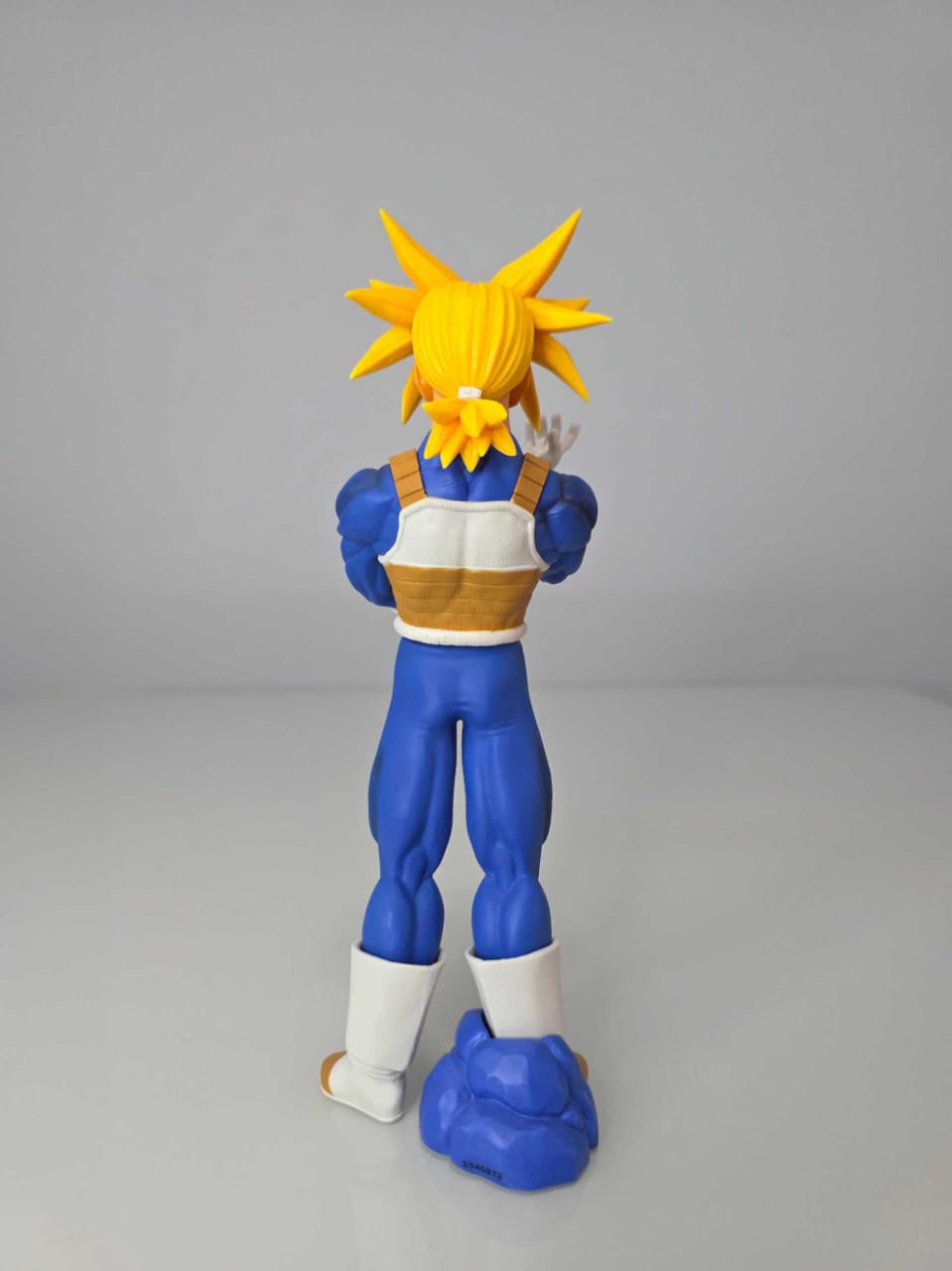 Figura de Trunks transformado en Super Saiyan con su icónica armadura saiyana, ajustándose los guantes antes de la batalla. Parte de la línea Solid Edge Works, destaca por su acabado mate y el realismo de la musculatura y expresión seria.