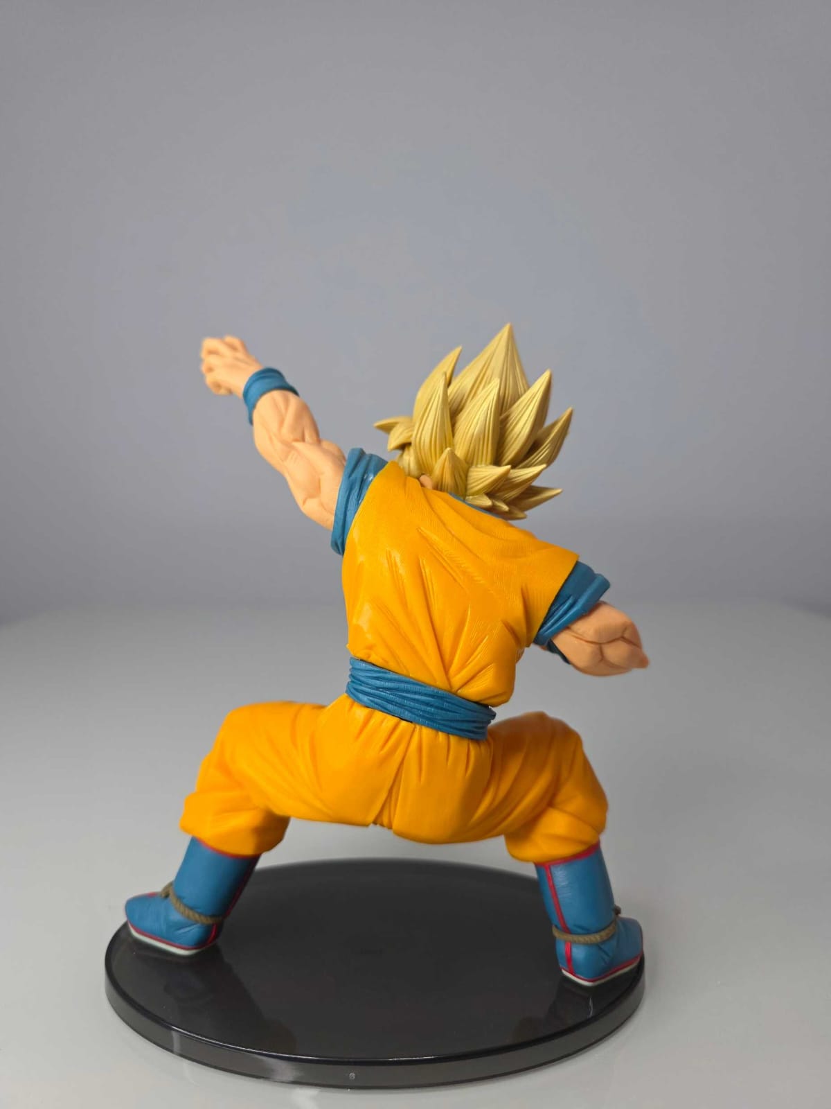Figura de Goku en Super Saiyan, recreando su postura lista para el combate durante la saga de Majin Buu. Detallado esculpido con efecto de movimiento en la ropa y cabello.