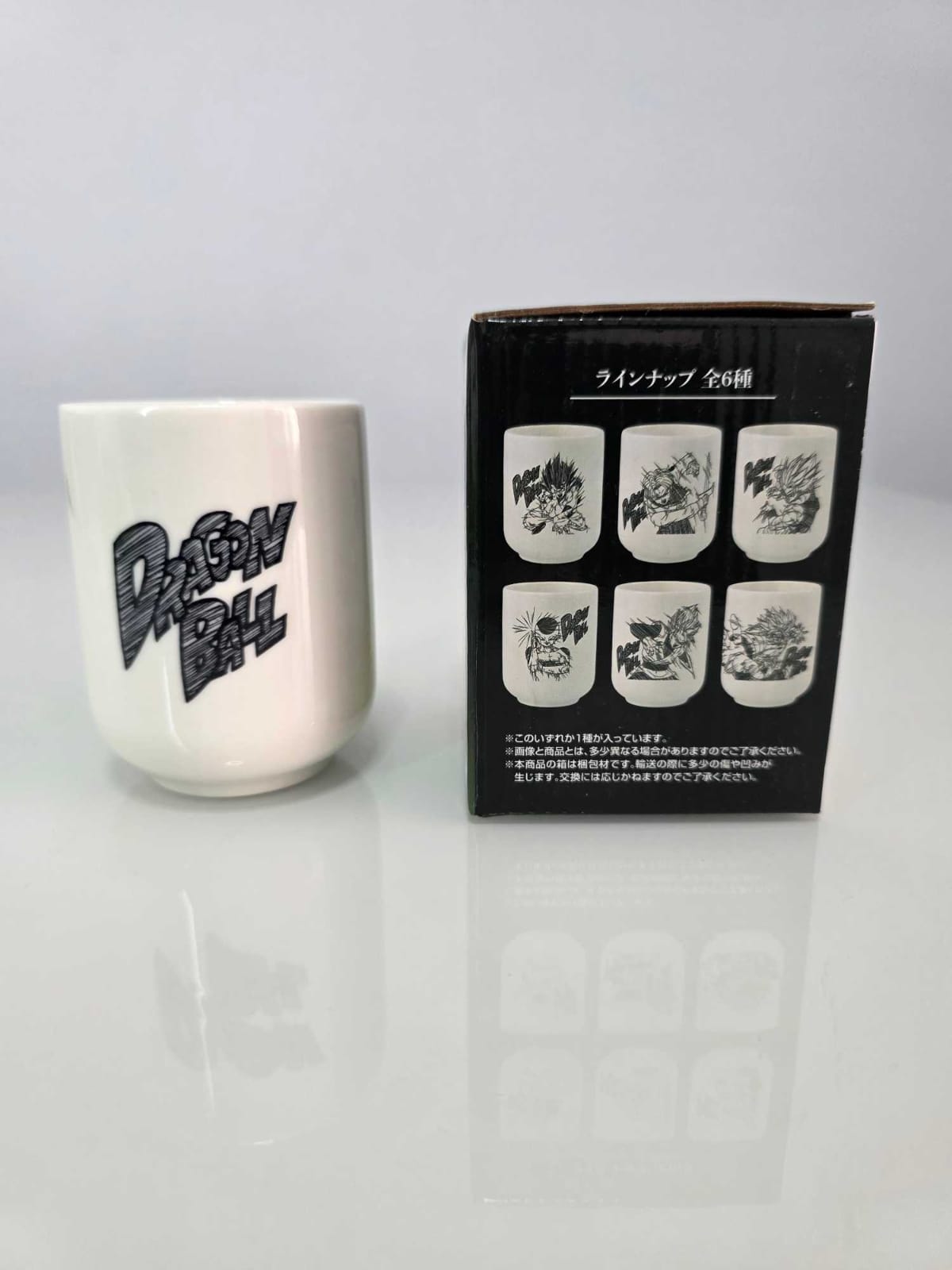 Taza tradicional japonesa (yunomi) con arte de trazo negro sobre blanco, estética manga. Perfecta para coleccionistas que prefieren piezas de loza oficial Bandai.