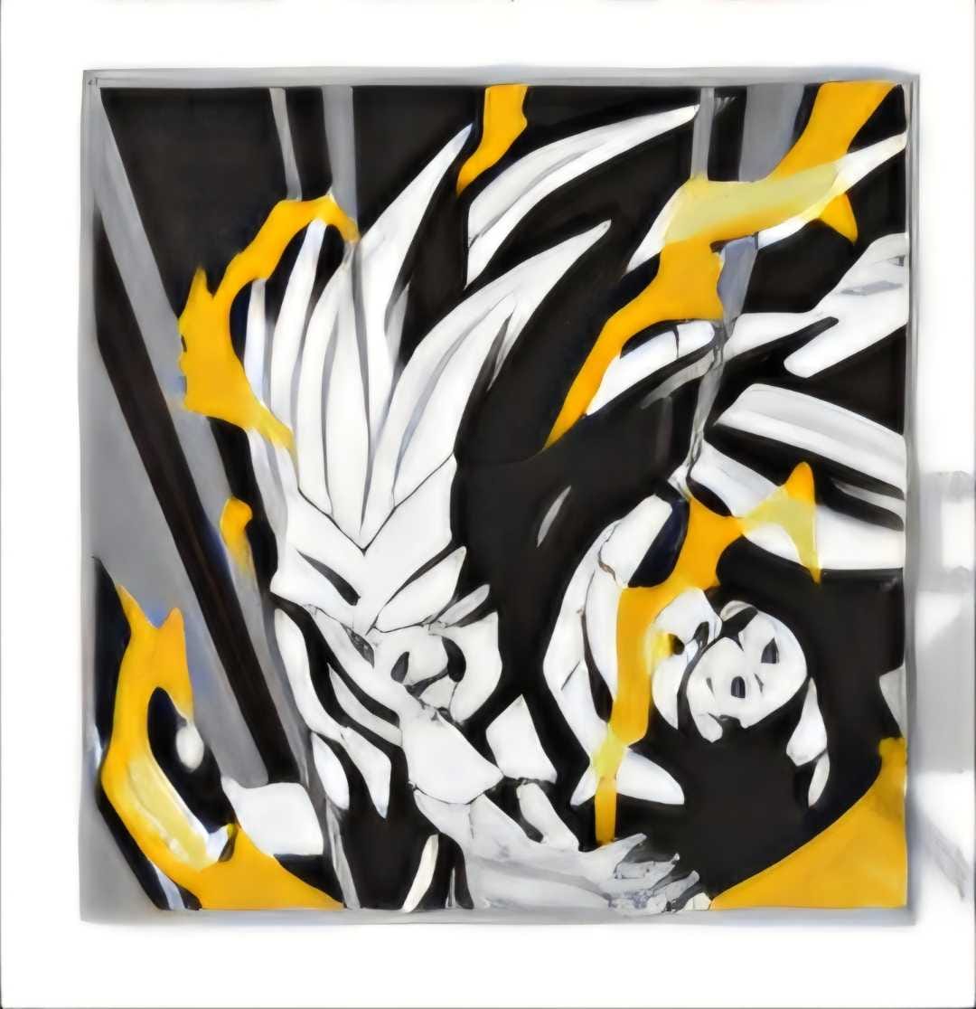 Impresionante diseño de Gotenks SSJ3 con tonos negros, grises y rayos amarillos.