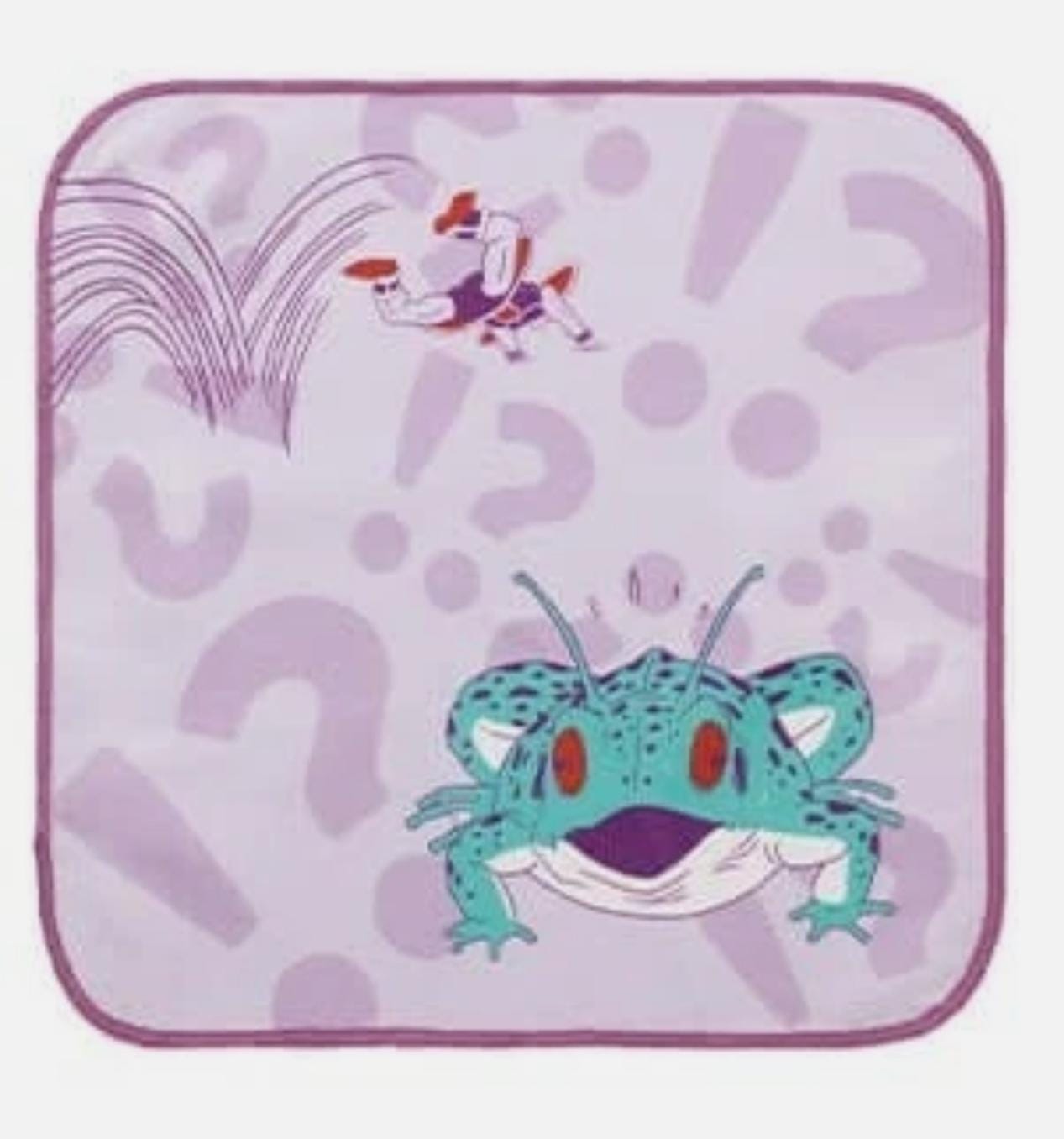 Ginyu en su forma de rana sobre un fondo lila con signos de interrogación.