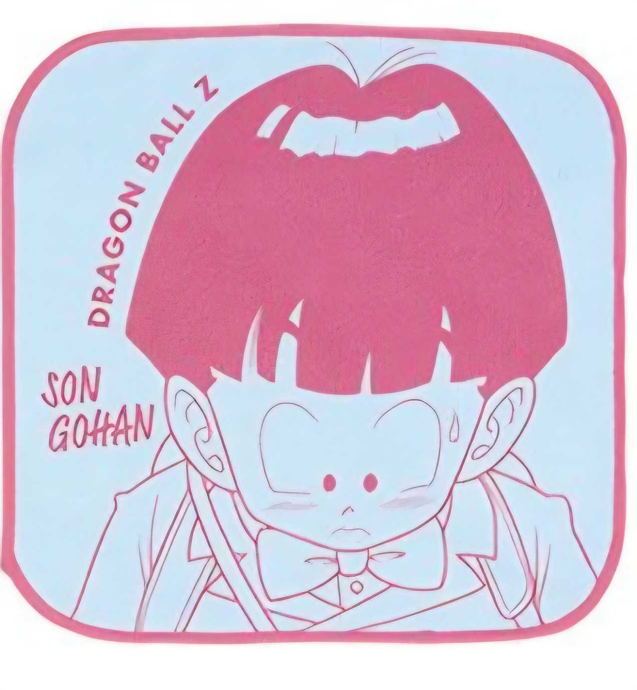 Diseño de Gohan niño con fondo celeste y cabello rosado.