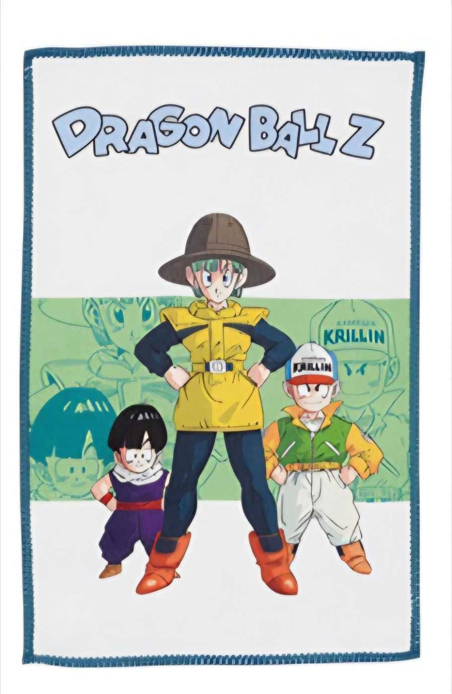 Bulma con su atuendo de exploradora junto a Gohan y Krillin, fondo verde esmeralda.