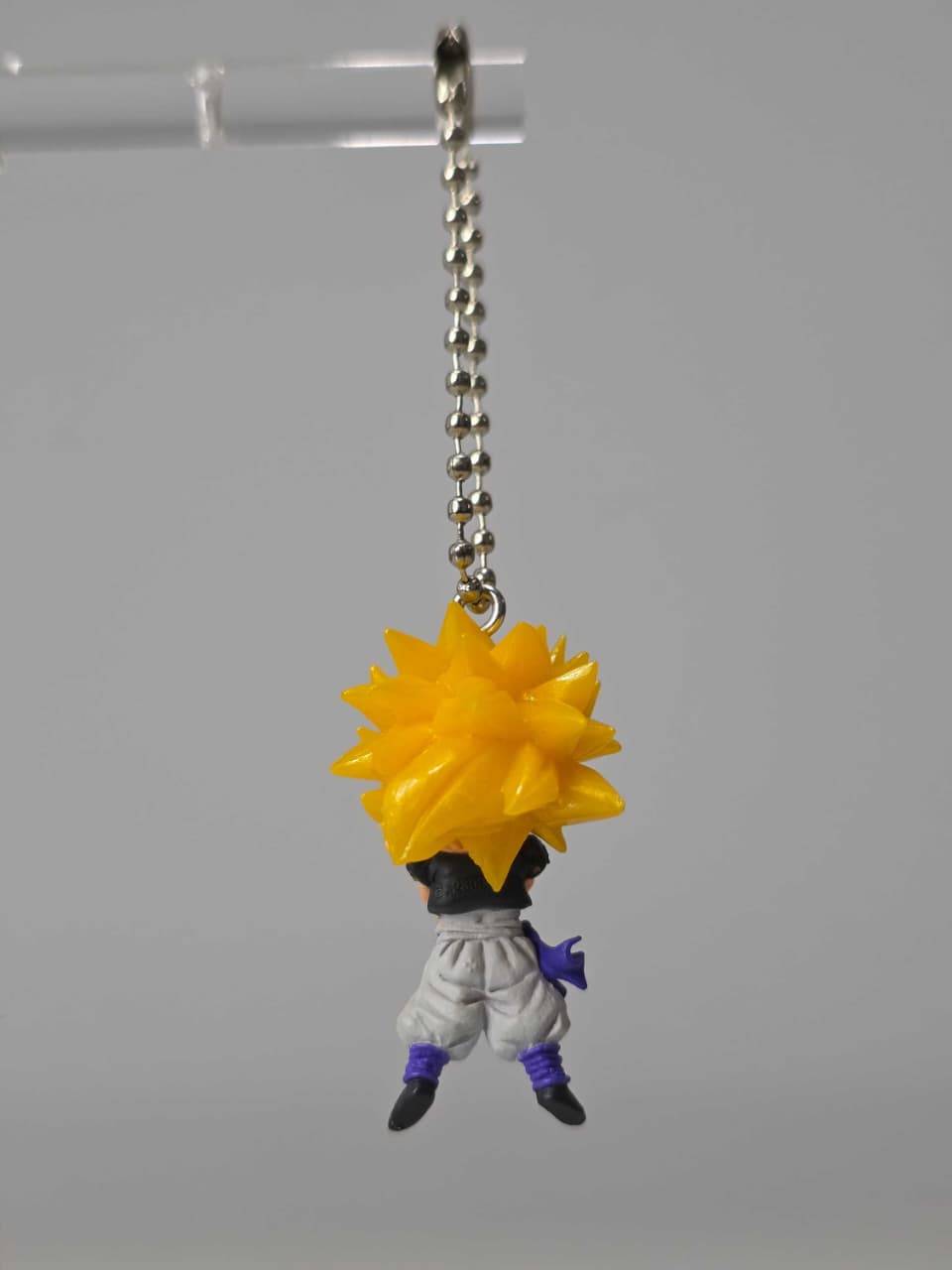 Cabello amarillo con mechones largos, expresión desafiante y ropa similar a GT.