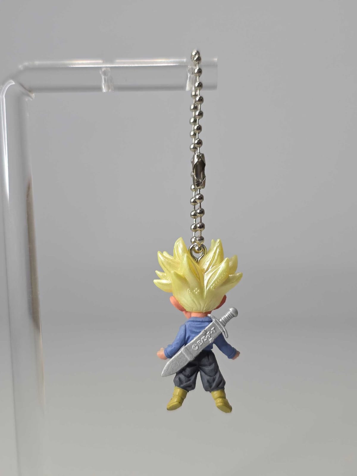 Cabello dorado brillante, bufanda roja y espada al hombro.