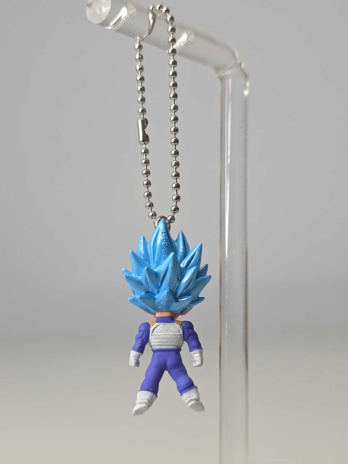Vegeta con su armadura clásica en blanco y azul, cabello azul metálico.
