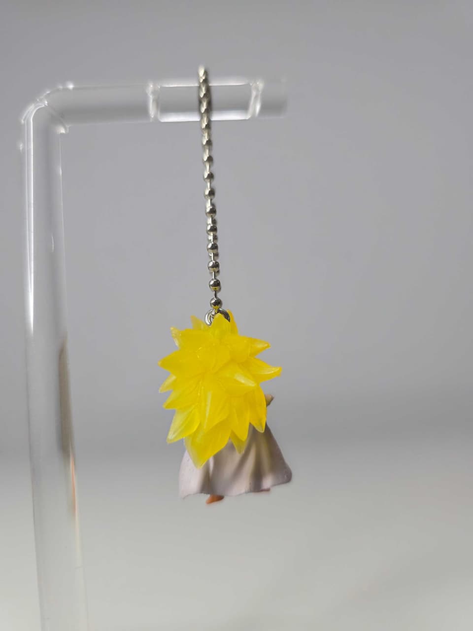 Gohan con cabello dorado largo y capa blanca, traje morado de entrenamiento.