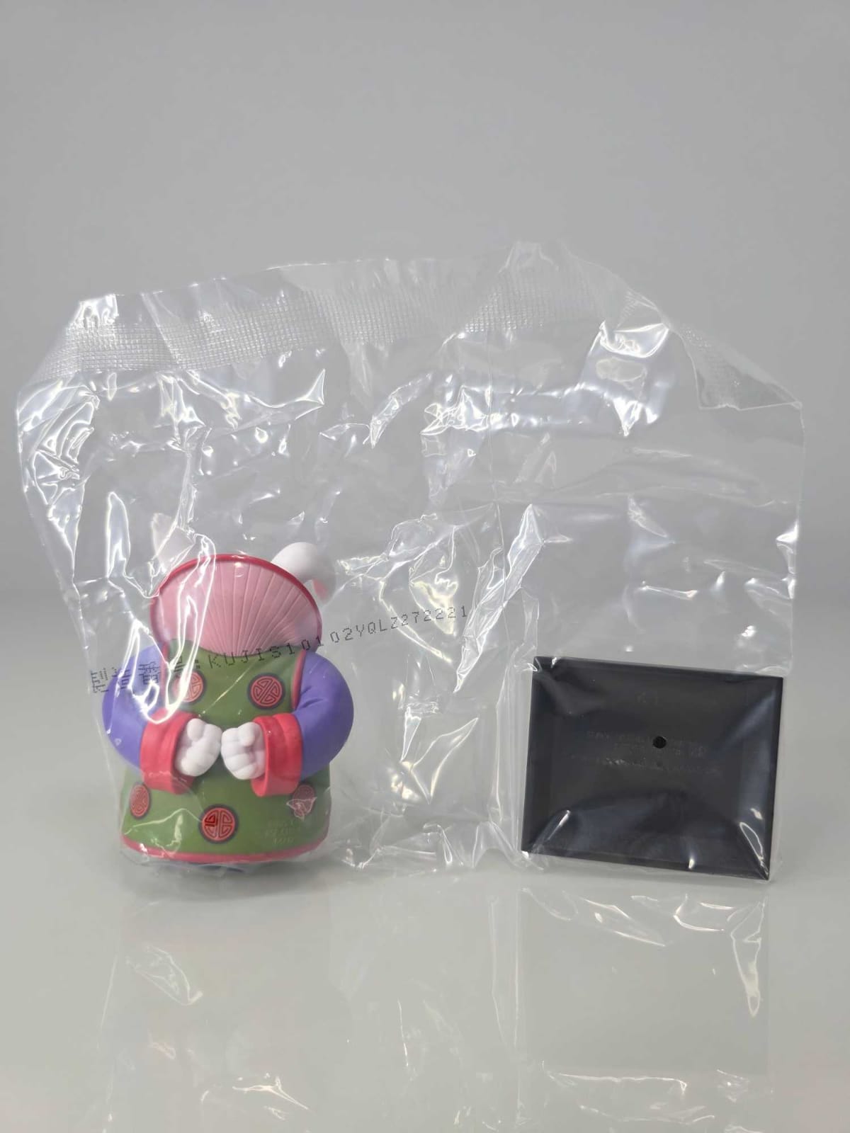 Representado con su túnica verde decorada con el símbolo del conejo y sus gafas oscuras, tal como aparece en la saga original de Dragon Ball.