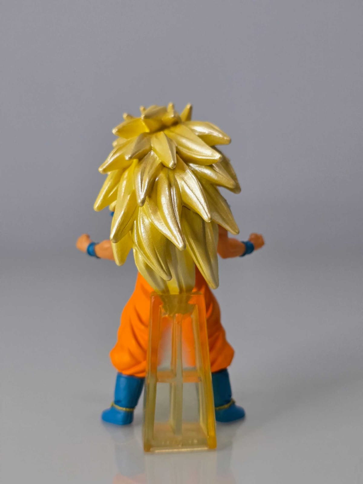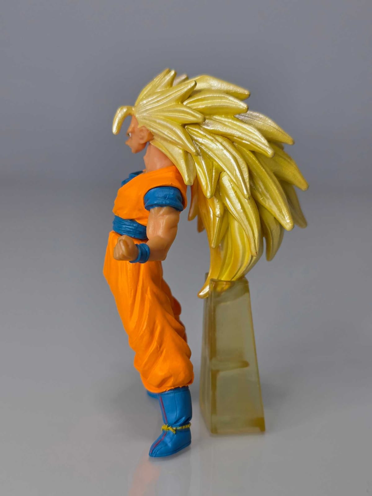 Figura de Goku Super Saiyajin 3 con expresión intensa, canalizando su energía antes de la batalla.