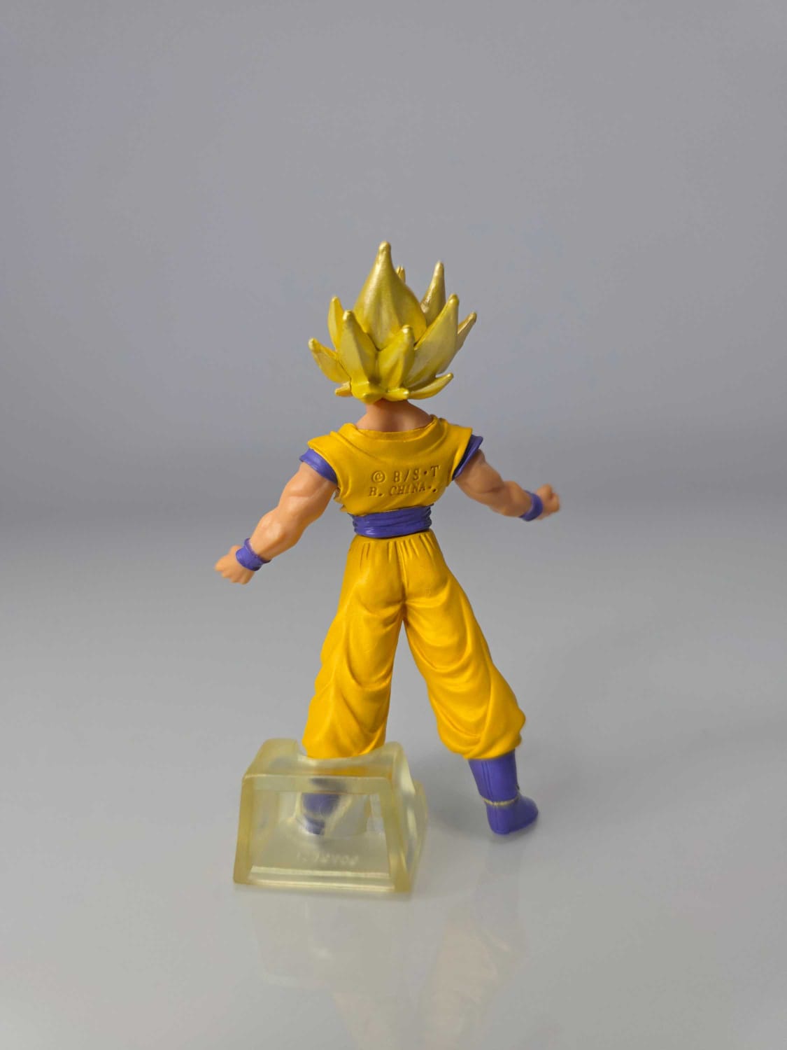 Figura de Goku Super Saiyajin con cabello dorado y postura de poder, gritando mientras acumula energía.