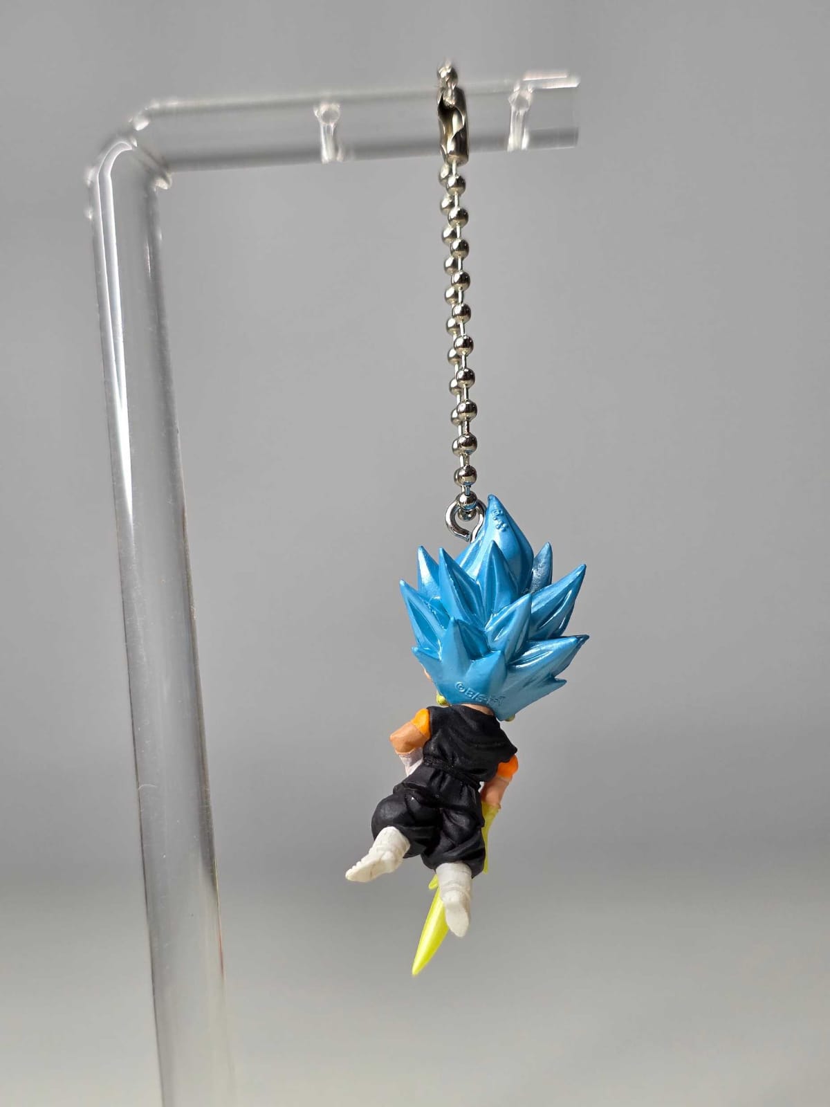 Vegito Xeno con cabello azul y ataque de energía amarilla en mano, traje negro y naranja, pose dinámica de combate.