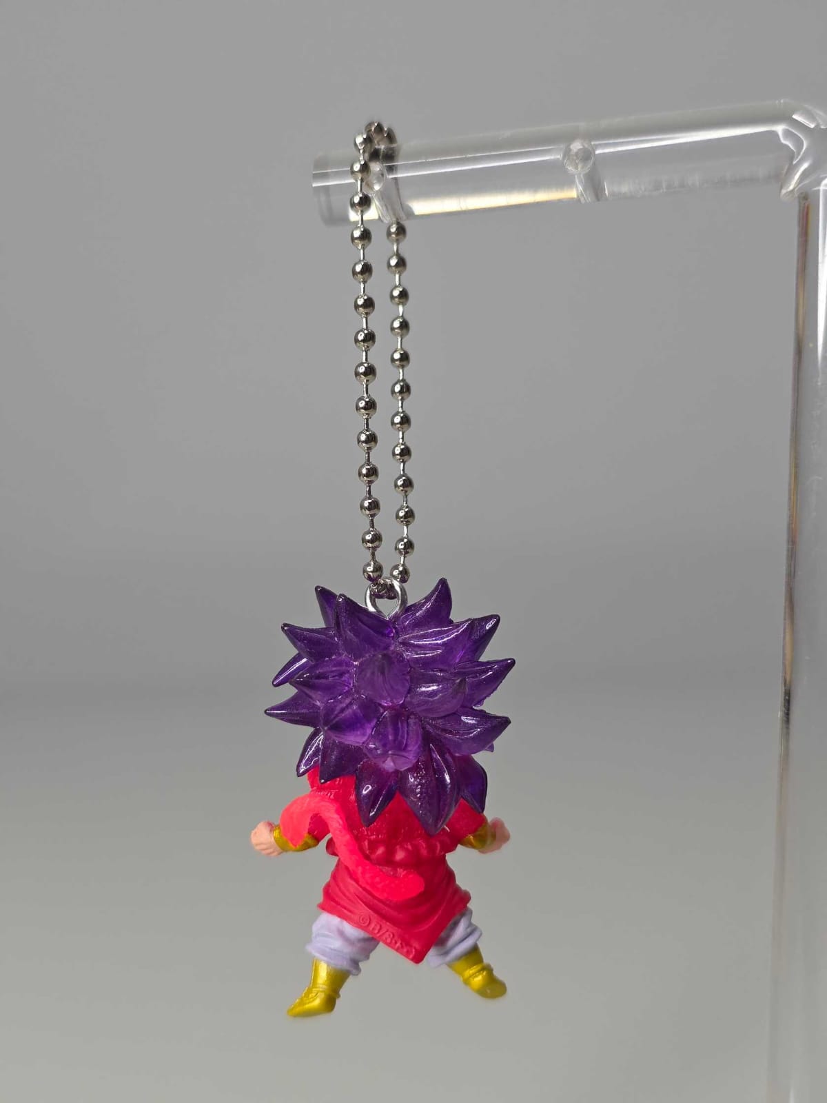 Broly Super Saiyajin 4 con cabello púrpura y traje rojo, detalles dorados y expresión de furia.
