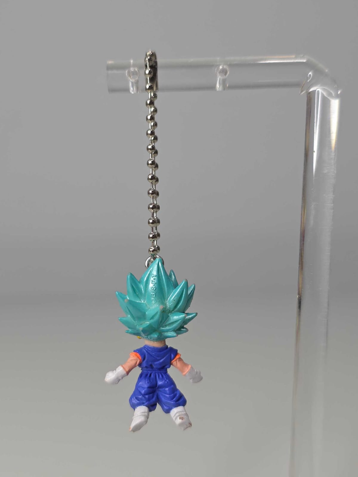 Vegito Super Saiyajin Blue con cabello celeste, traje azul y naranja, expresión de poder y pose de ataque.