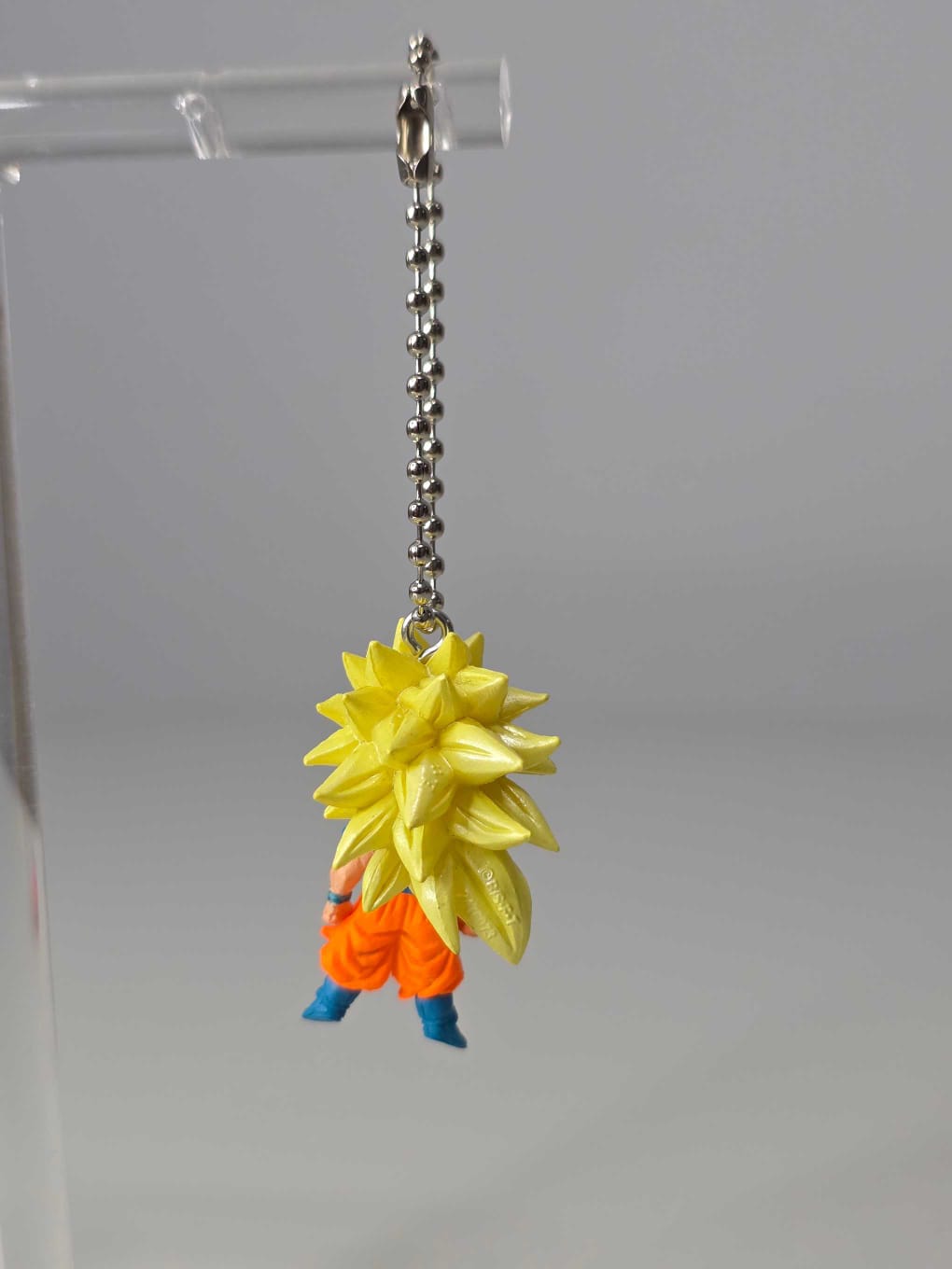 Gokú Super Saiyajin 3 con cabello largo dorado, gi naranja rasgado y expresión de combate intenso.