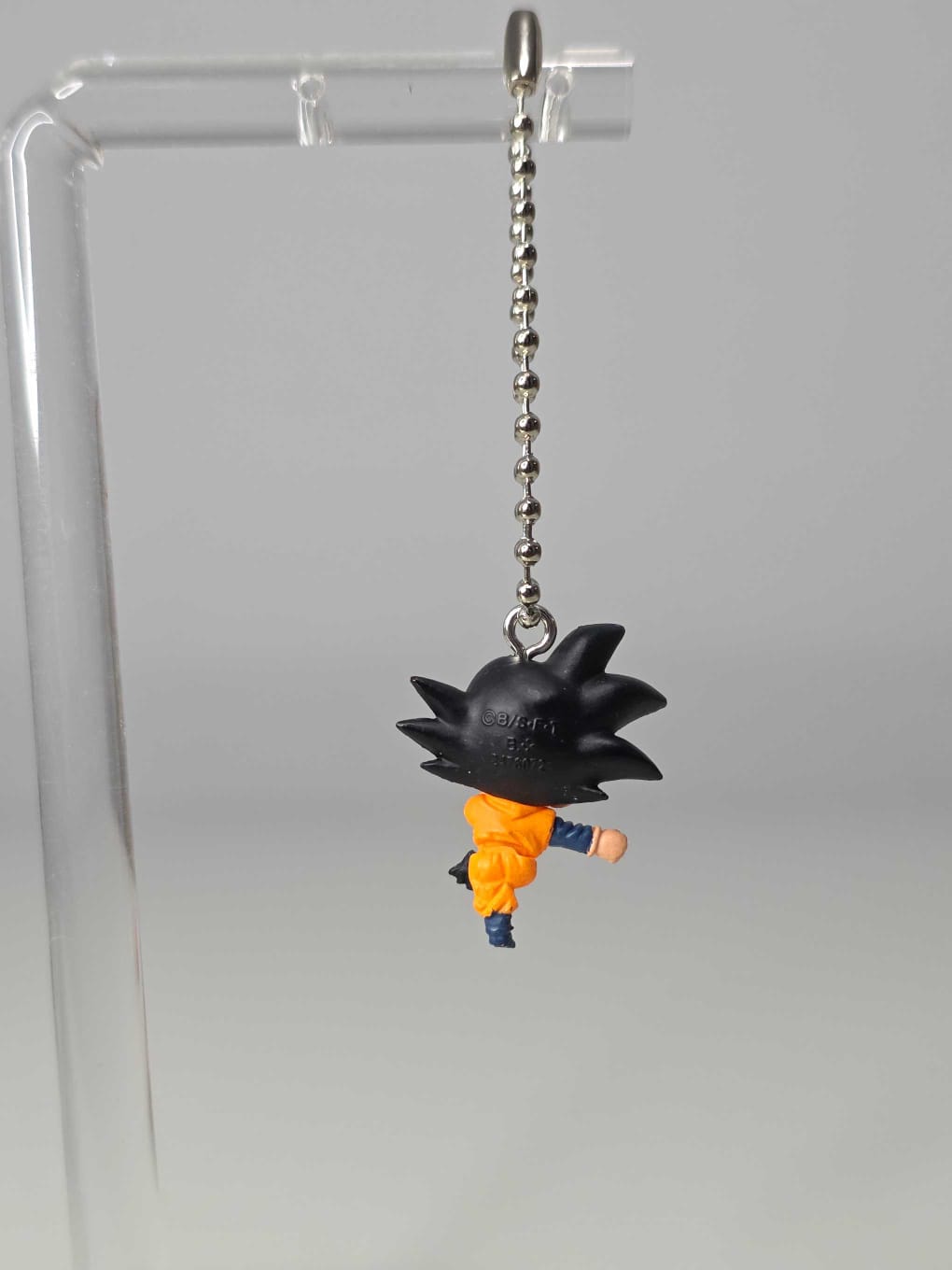 Goten en posición de fusión, traje naranja y azul, expresión concentrada y dinámica.