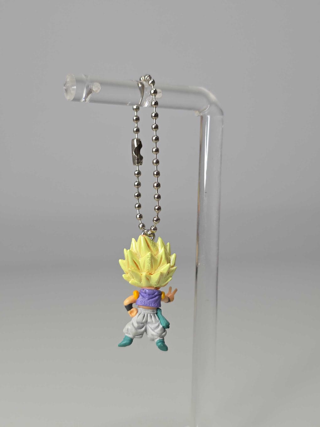 Gotenks Super Saiyajin haciendo la señal de victoria con los dedos, cabello dorado y vestimenta característica de la fusión, con pantalones blancos y cinturón verde.