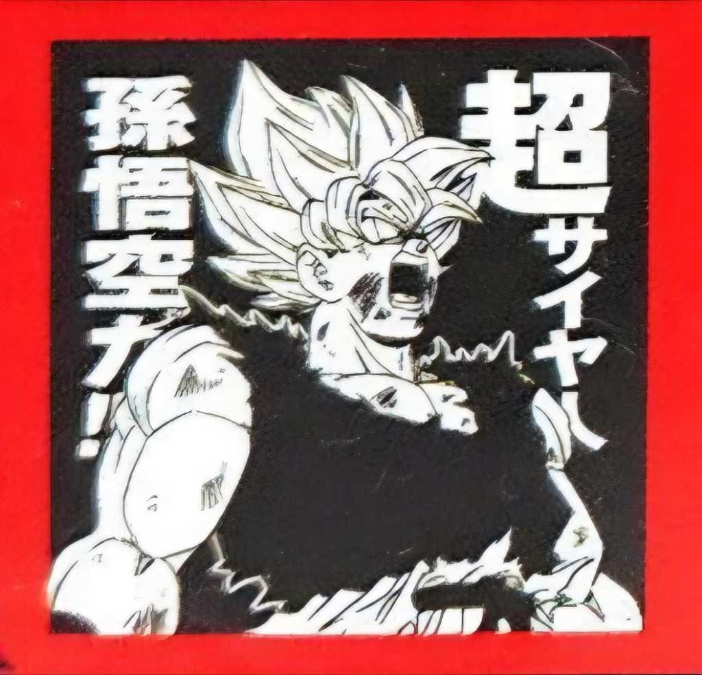 Goku Super Saiyajin gritando con energía desbordante, inspirado en su transformación en Namek, fondo con texto japonés.