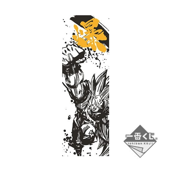 Goku Super Saiyajin 3 en diseño artístico blanco y negro con detalles dorados, capturando su expresión intensa y energía desbordante.