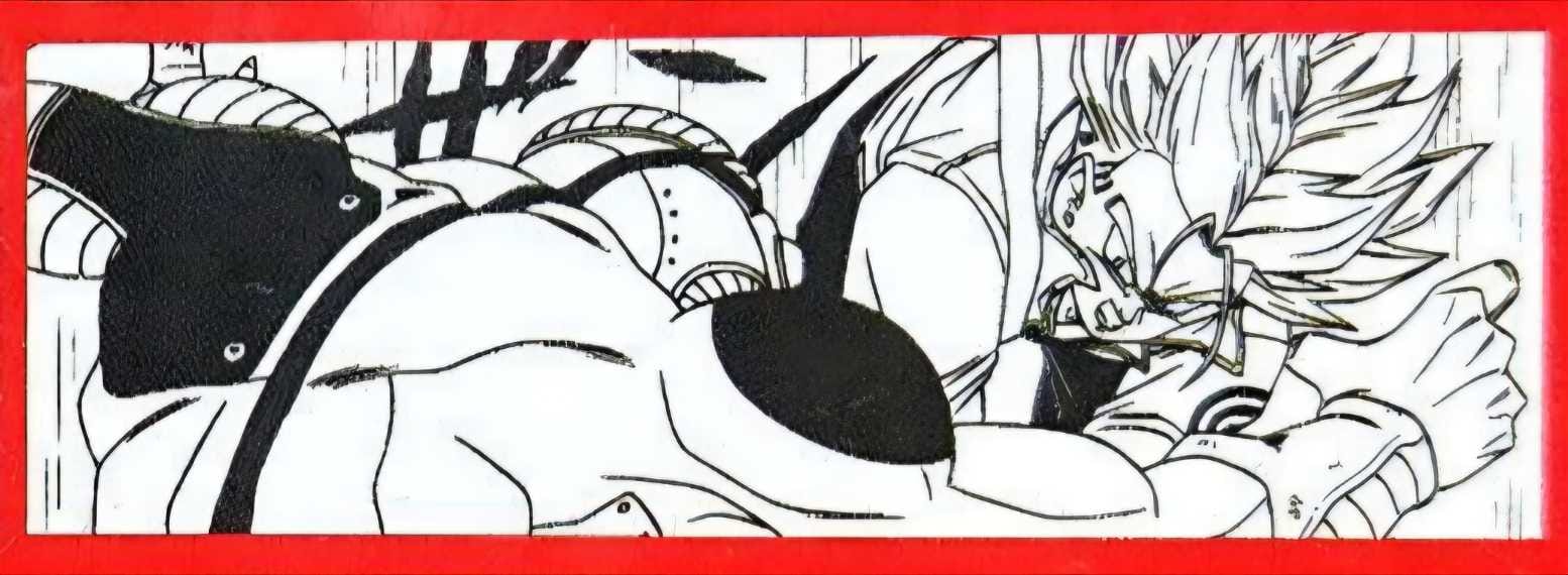 Trunks del futuro cortando a Freezer en su icónica aparición en Dragon Ball Z. Diseño tipo manga en blanco y negro con marco rojo.